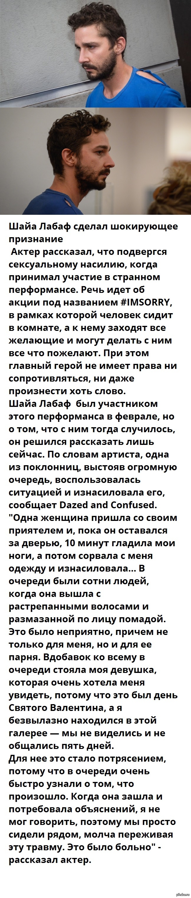 1 oOFALCONOo 10 лет назад Шайа Лабаф заявил, что его изнасиловали Шайа Лабаф Длиннопост Странности Одиночество