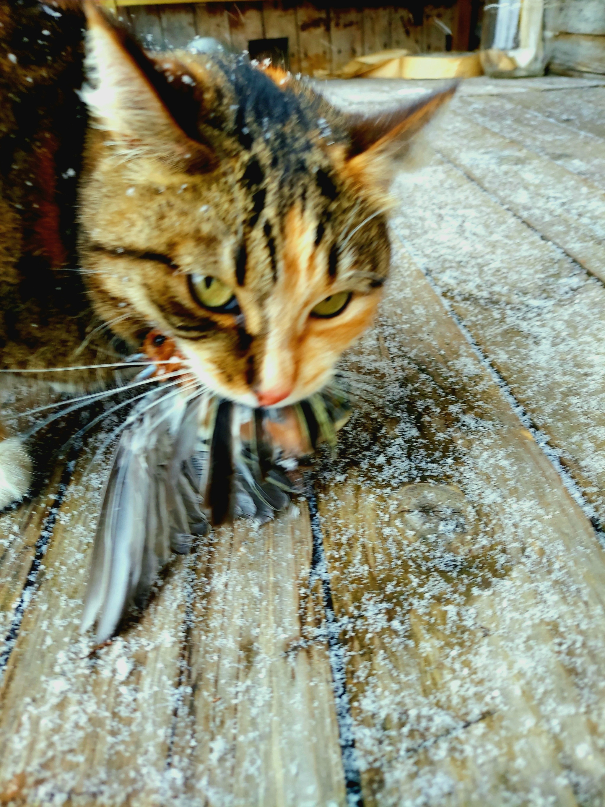 У меня так кошка сиганула с форточки на голубя который выёбывался на балконе. Я из школы пришёл, кругом перья.