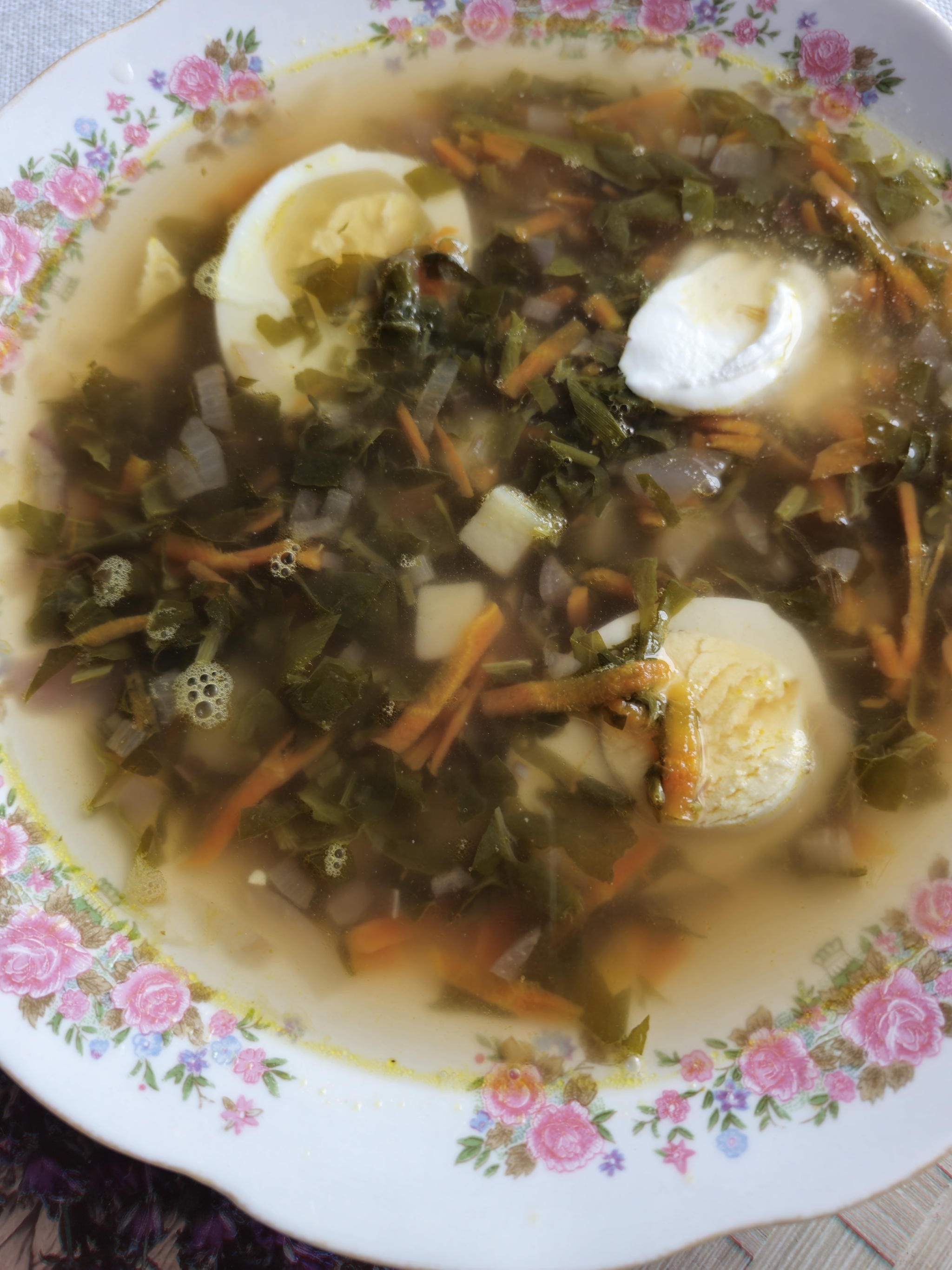 А ещё супчик сварила. Суп из щавеля варю и как щи, с говядиной, томатом, только вместо капусты - щавель. И простой, без мяса, но с яичком и сметаной. Этот вариант сегодня перед работой за полчаса сварганила.