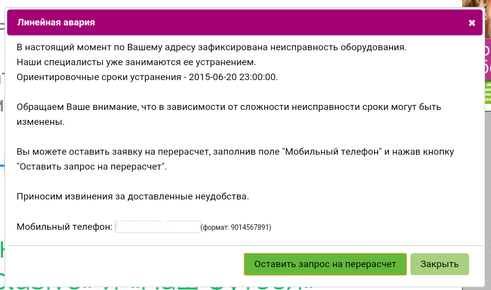 Жадности и наглости абонента нет края.Ты наверное хотел чтобы тебе пересчитали за пару часов простоя минимум половину абон. платы?Да еще и официальное извинение принесли за прошедший дождик??НУ-ну!!