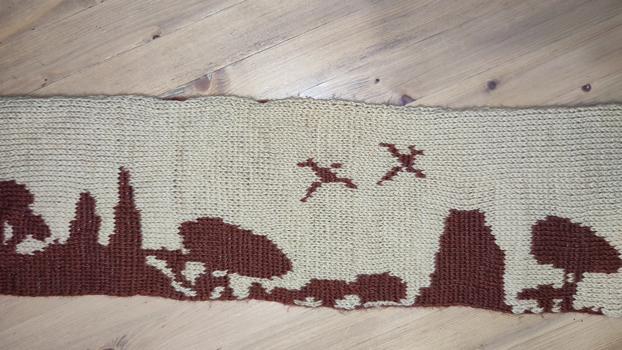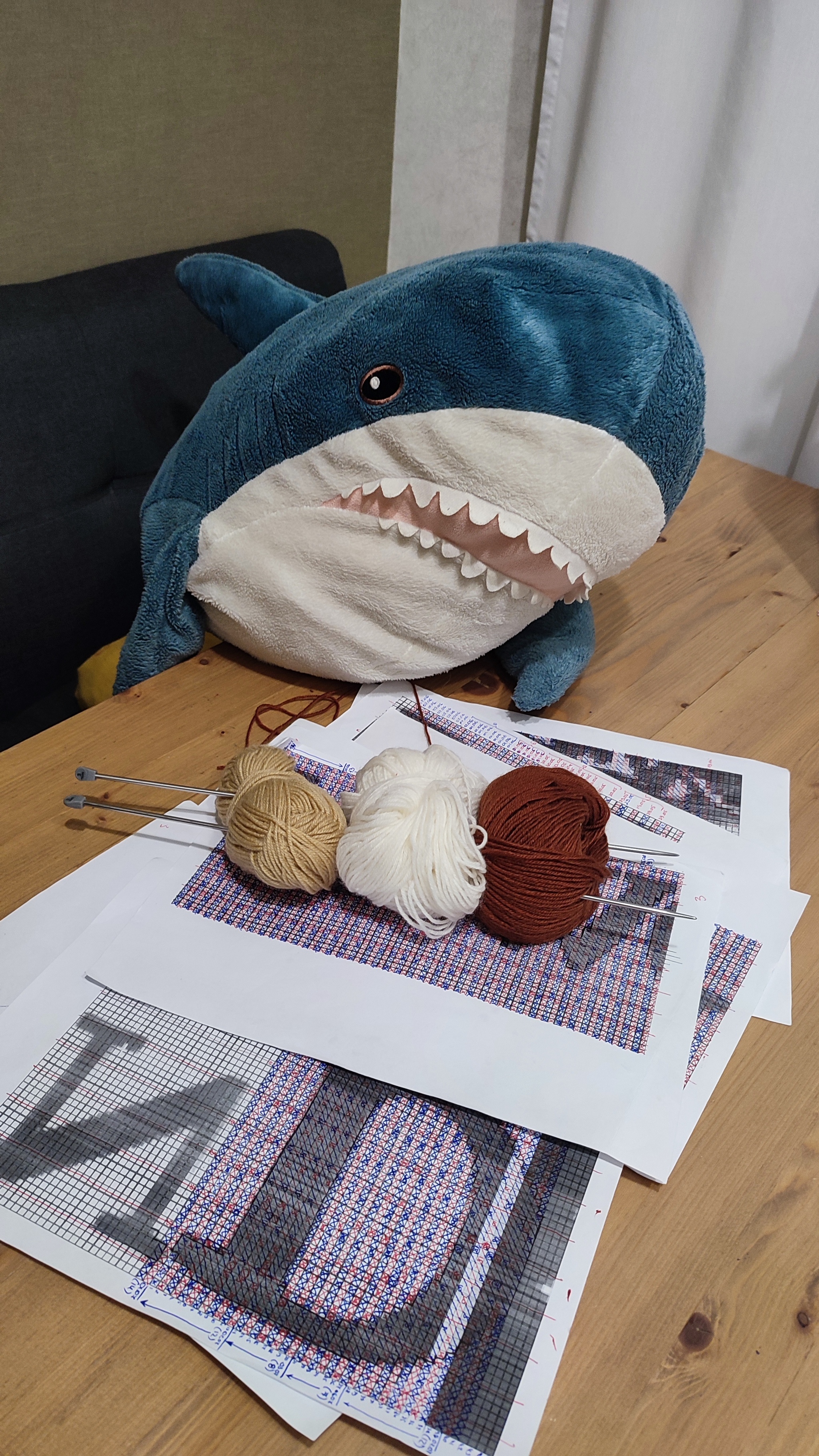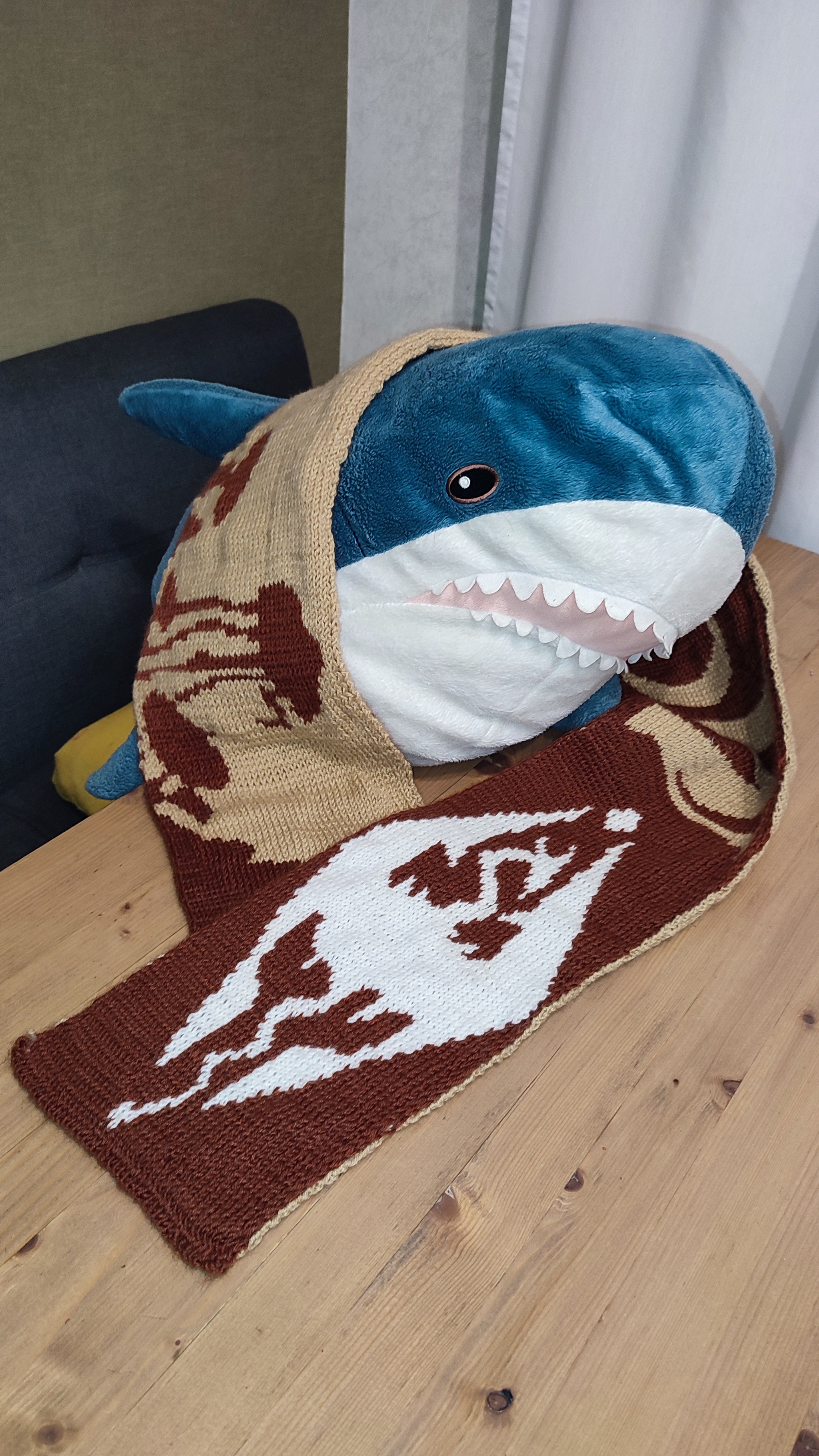 Приветствую всех. Закончен очередной шарф в технике двусторонний жаккард. В этот раз решил сделать ассиметричный рисунок. В целом все прошло удачно, были сделаны две схемы, по которым все вязалось.