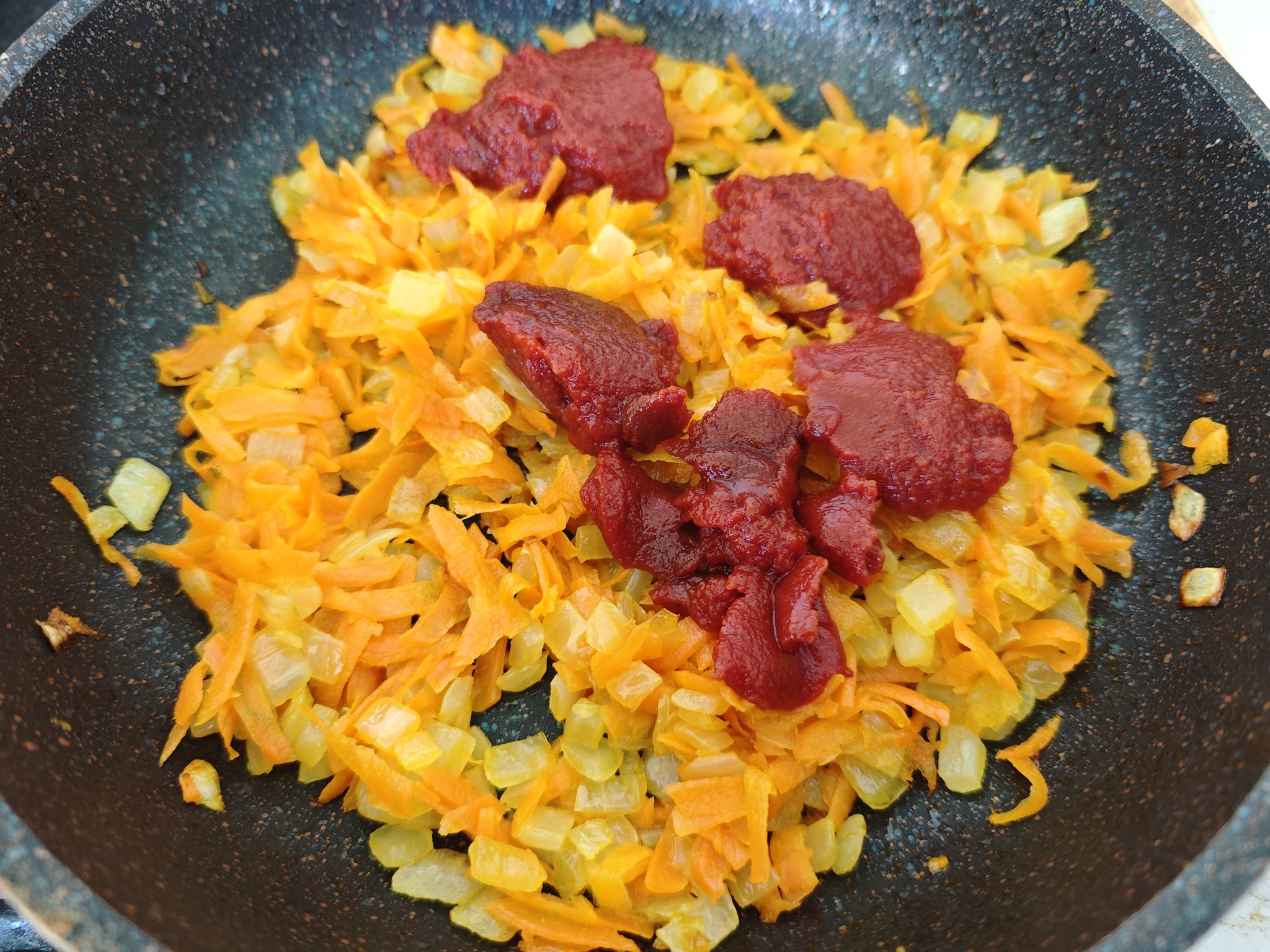 4. На сковороде на растительном масле сначала пассируем лук, пока он не отдаст влагу и зазолотится и только потом добавляем морковь. После размягчения последней добавляем томатную пасту и обжариваем еще пару минут.