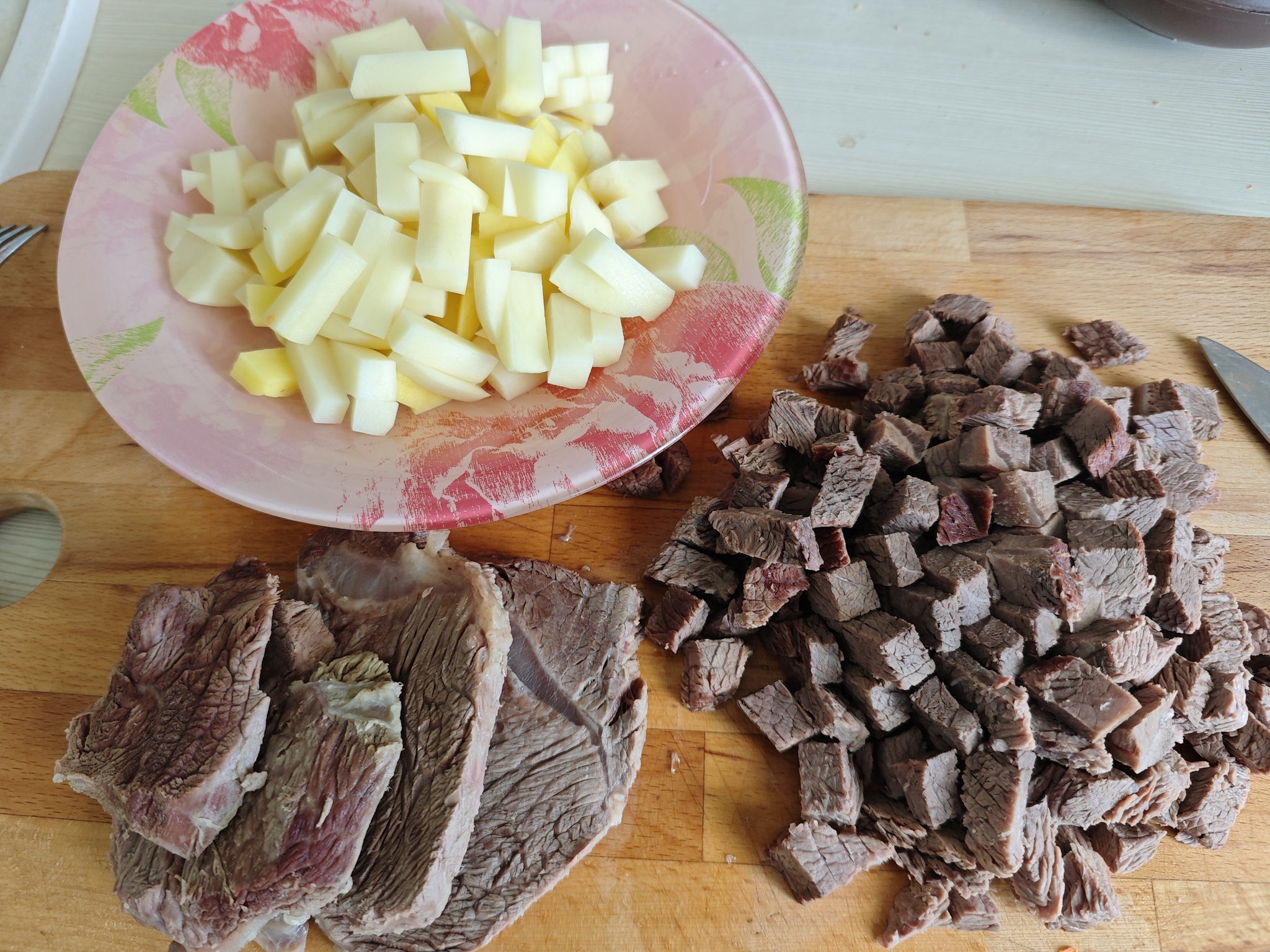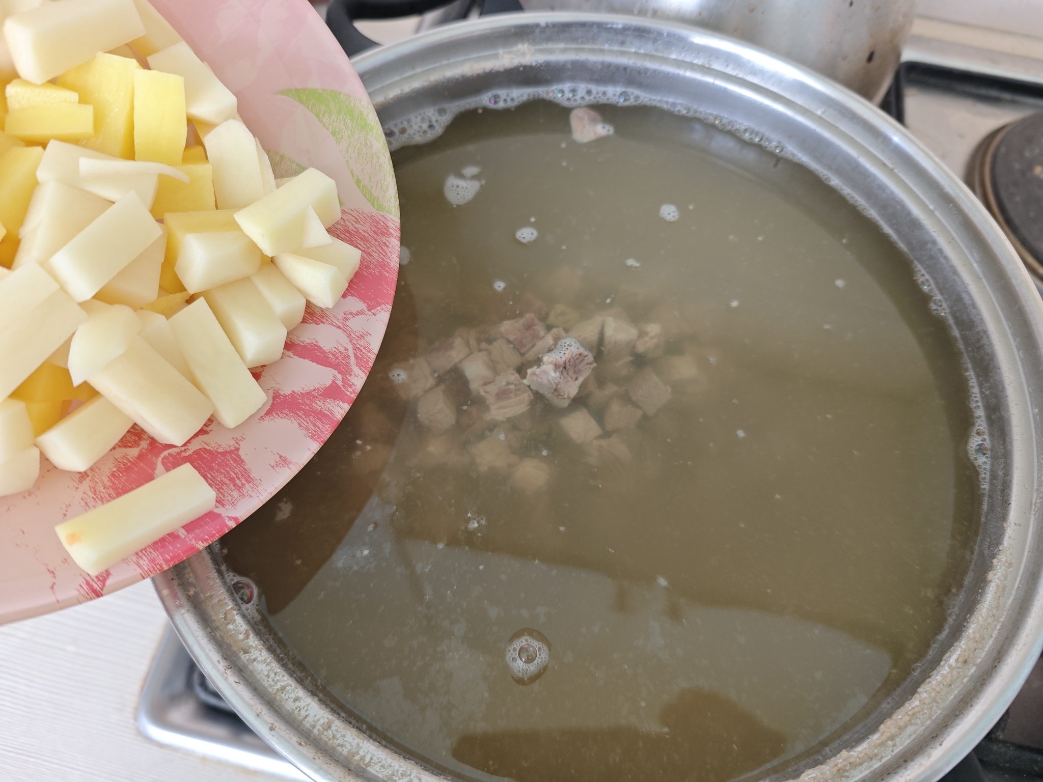 6. Мясо нарезаем на кубики 1-1.5см. Возвращаем его в бульон и закладываем туда картофель. Варим после повторного закипания 15 минут.