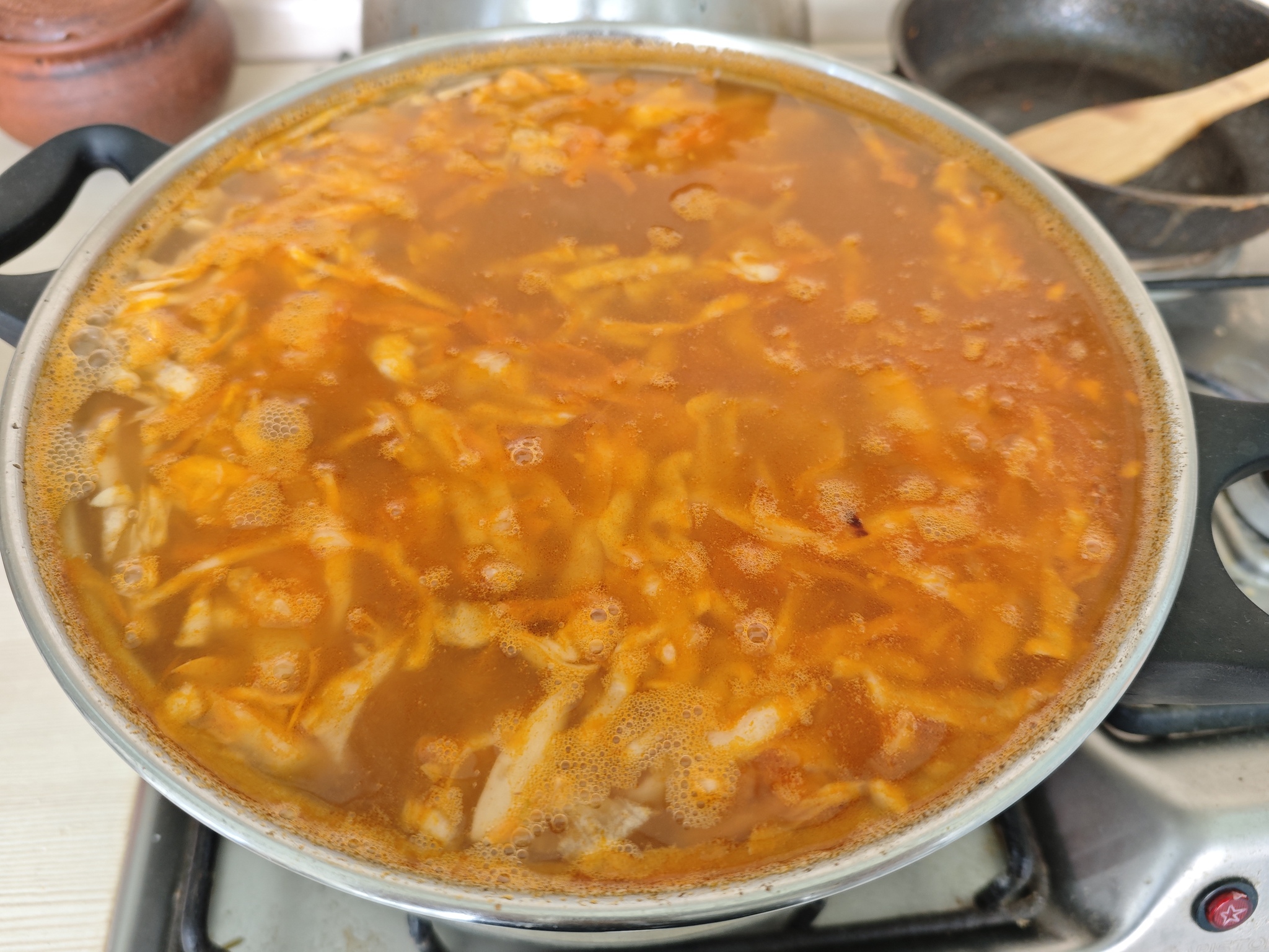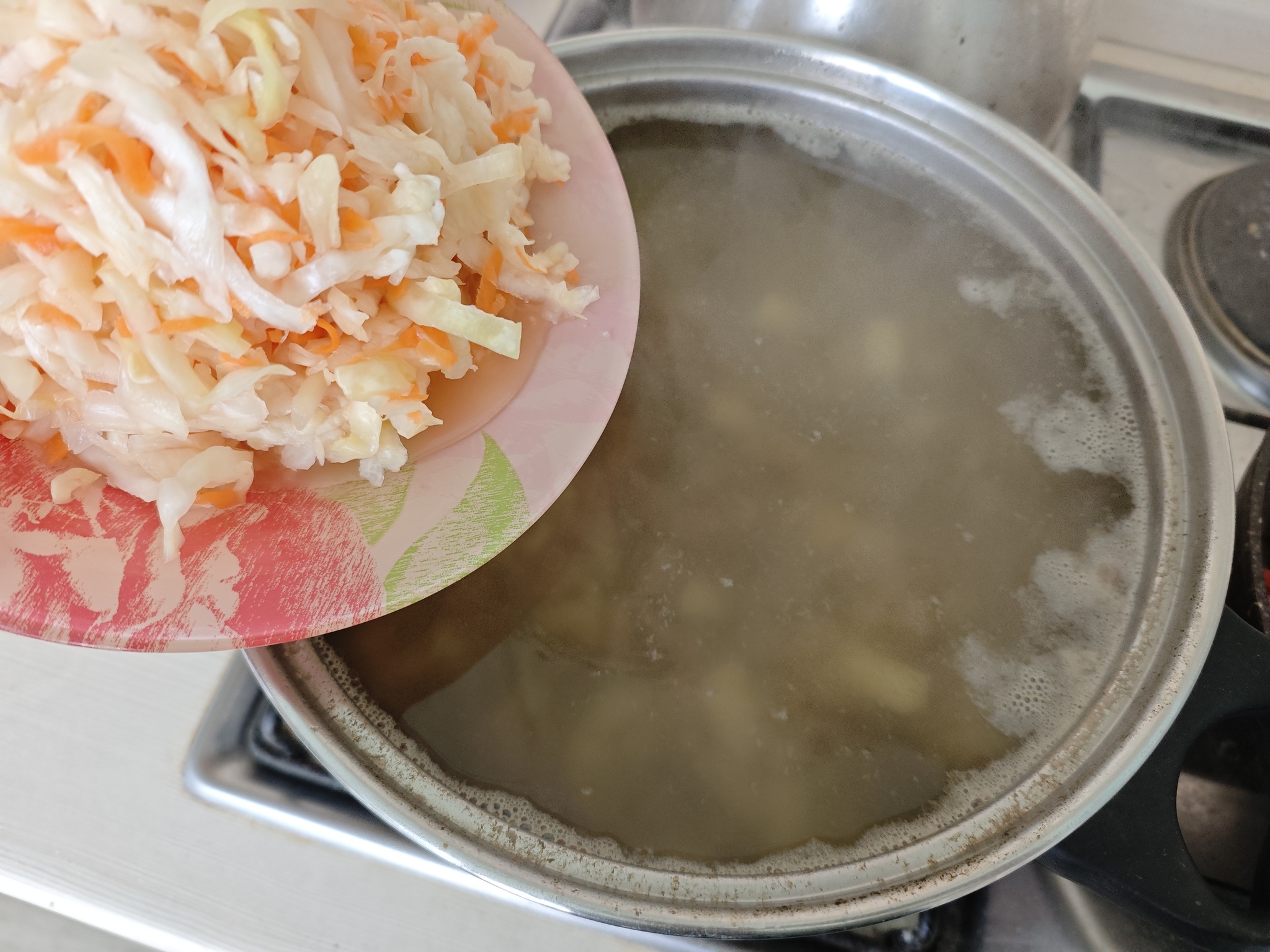 7. ВАЖНО! Только после проварки картофеля до полуготовности (15 минут) можно засыпать квашеную капусту. Иначе, если заложить в будущий суп все сразу – кислота капусты сделает картофель жестким! Варим еще 30 минут.