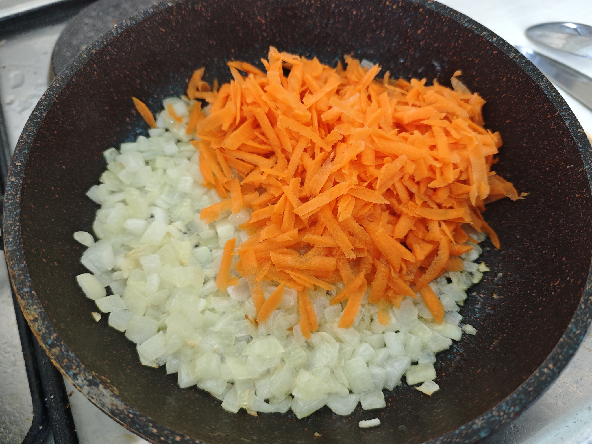 3. Натираем на крупной терке морковь и мелко нарезаем лук (помните, у нас в запасе одна луковица?)