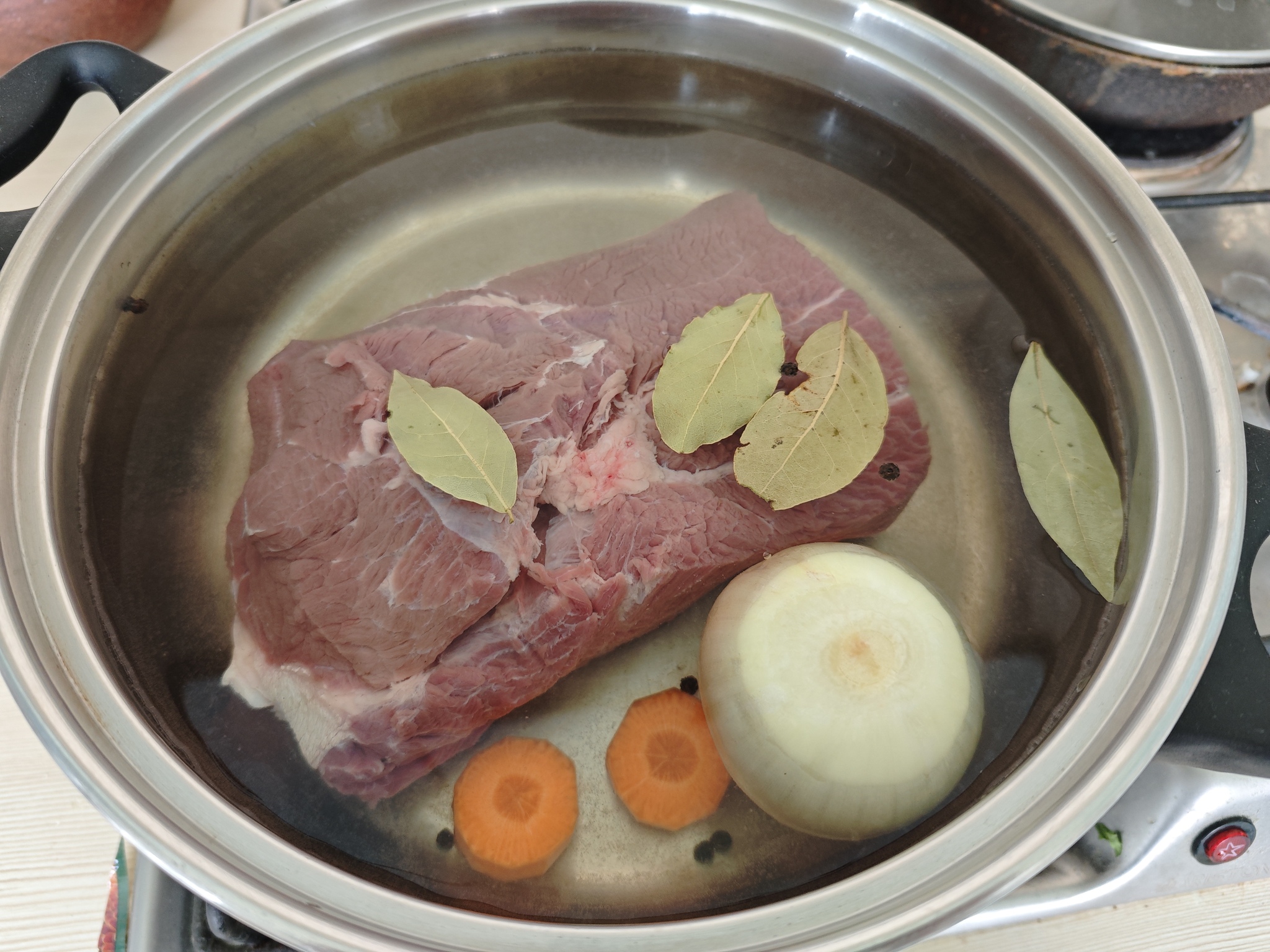 1. Мясо с очищенной луковицей (надрезанной по «экватору»), половинкой моркови (порезанной на крупные дольки), лаврушкой, солью и черным перцем, заливаем водой и ставим на огонь.