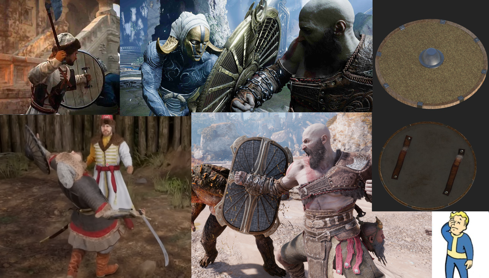 Нет, а были ли круглые щиты с локтевым хватом? — да полно, вот только это стальное блюдце по центру называется умбон, и если уж оно там есть то призвано прикрывать кулак а хват такого щита с умбоном, соответственно, называется кулачным и вот это очевидное, казалось бы, замечание далеко не очевидно в массовой культуре — клеют его прямо к предплечью силой.