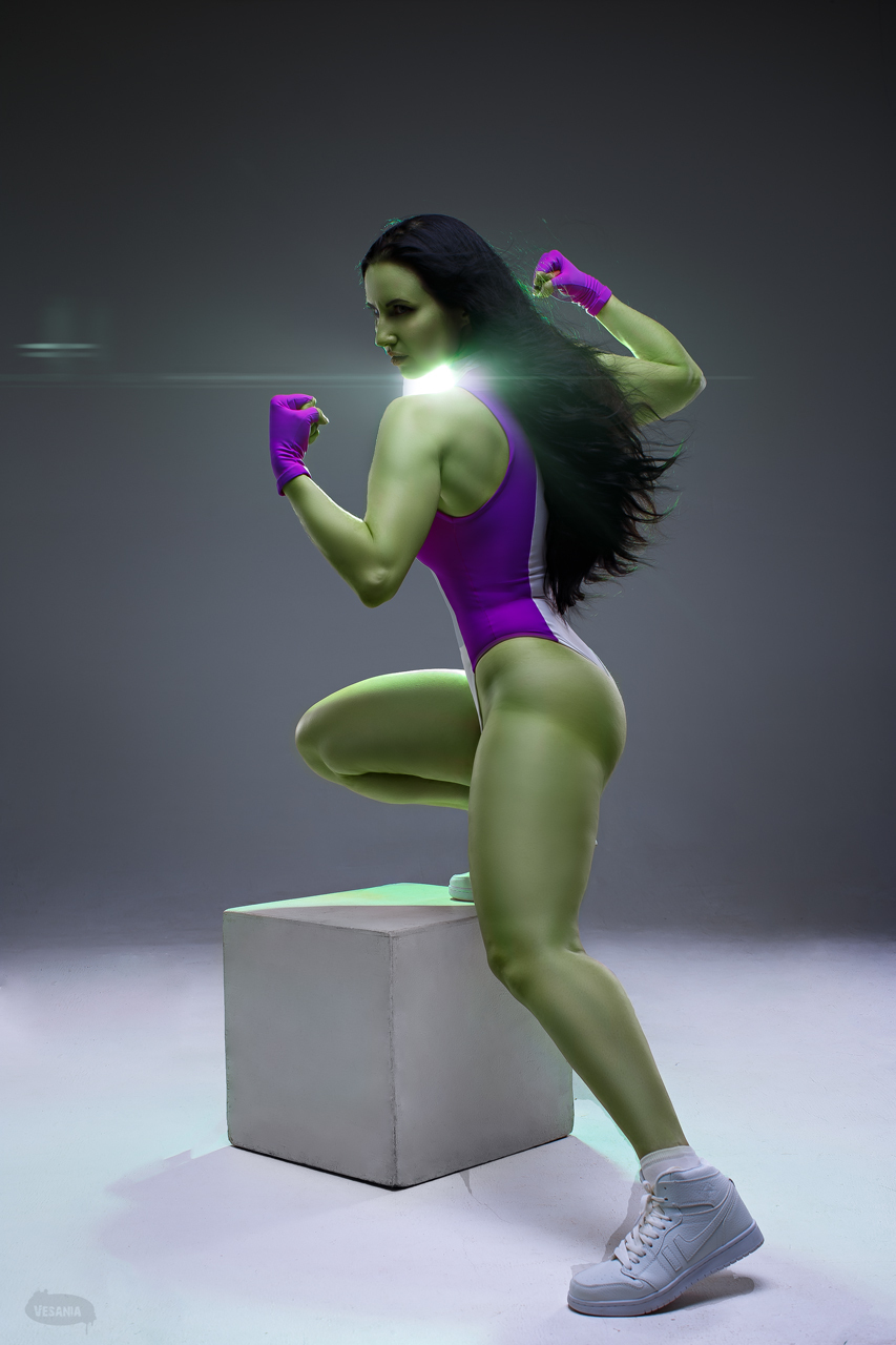 Женщина-Халк - персонаж, на которого меня уговаривали несколько лет, ещё со времён активного фитнеса, поэтому переживала за результат. Я всегда восхищаюсь эстетикой женского тела и, занимаясь косплеем, стараюсь держать себя в тонусе. В комиксах персонажа рисовали по-разному, есть довольно мощные и конкретно просушенные версии, но мы взяли за основу золотую середину, учитывая, что захотелось показать и обычный вид на контрасте. Уважаю жёсткий бодифитнес и тех, кто им занимается, но себя именно в нём никогда не видела.