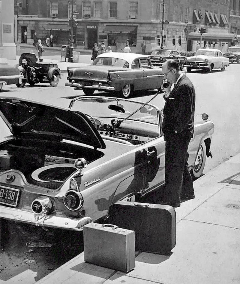 397 Beerlogeen Шел 1957 год, мы общались как могли 2 года назад Мужчина разговаривает по автомобильному телефону General Electric Type 47 на улице Нью-Йорка, 1957 год. США Телефон Мобильные телефоны Нью-Йорк Авто Черно-белое фото 3 2 Ещё 0