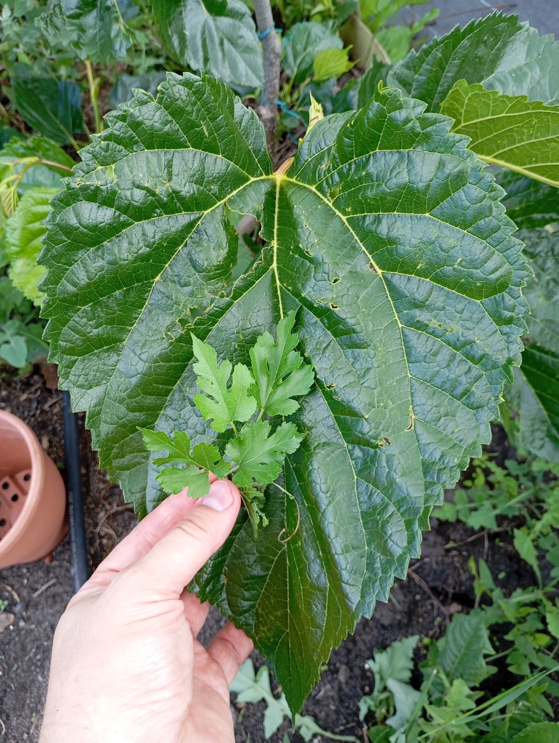 Современная наука считает, что листья на первом фото принадлежат двум разным экземплярам одного вида - Шелковица белая. Кстати, у разных деревьев белой шелковицы ягоды могут быть любого цвета - белые, розовые/лиловые, чёрные. Размер ягод тоже разный, от горошины до почти с палец размером.