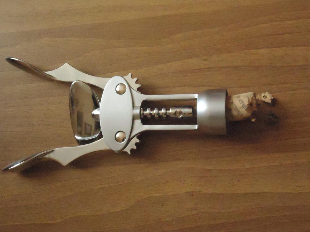 Когда вино готово к подаче, бутылку необходимо вскрыть. Для этого существует множество штопоров самых разнообразных конструкций, однако большинство из них для использования малопригодно. Классический штопор в виде спирали, торчащей из деревянной или пластмассовой рукояти, требует приложения довольно больших усилий, - особенно если пробка сидит достаточно плотно. Вдобавок, в момент выхода пробки из горлышка практически невозможно избежать довольно сильного встряхивания бутылки, - в результате осадок и винный камень поднимутся со дна, образовав довольно неэстетичную взвесь, а при неудачном раскладе существует и серьезная опасность пролить вино.