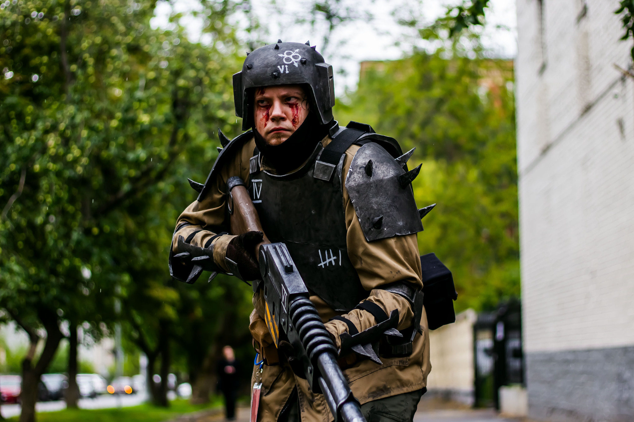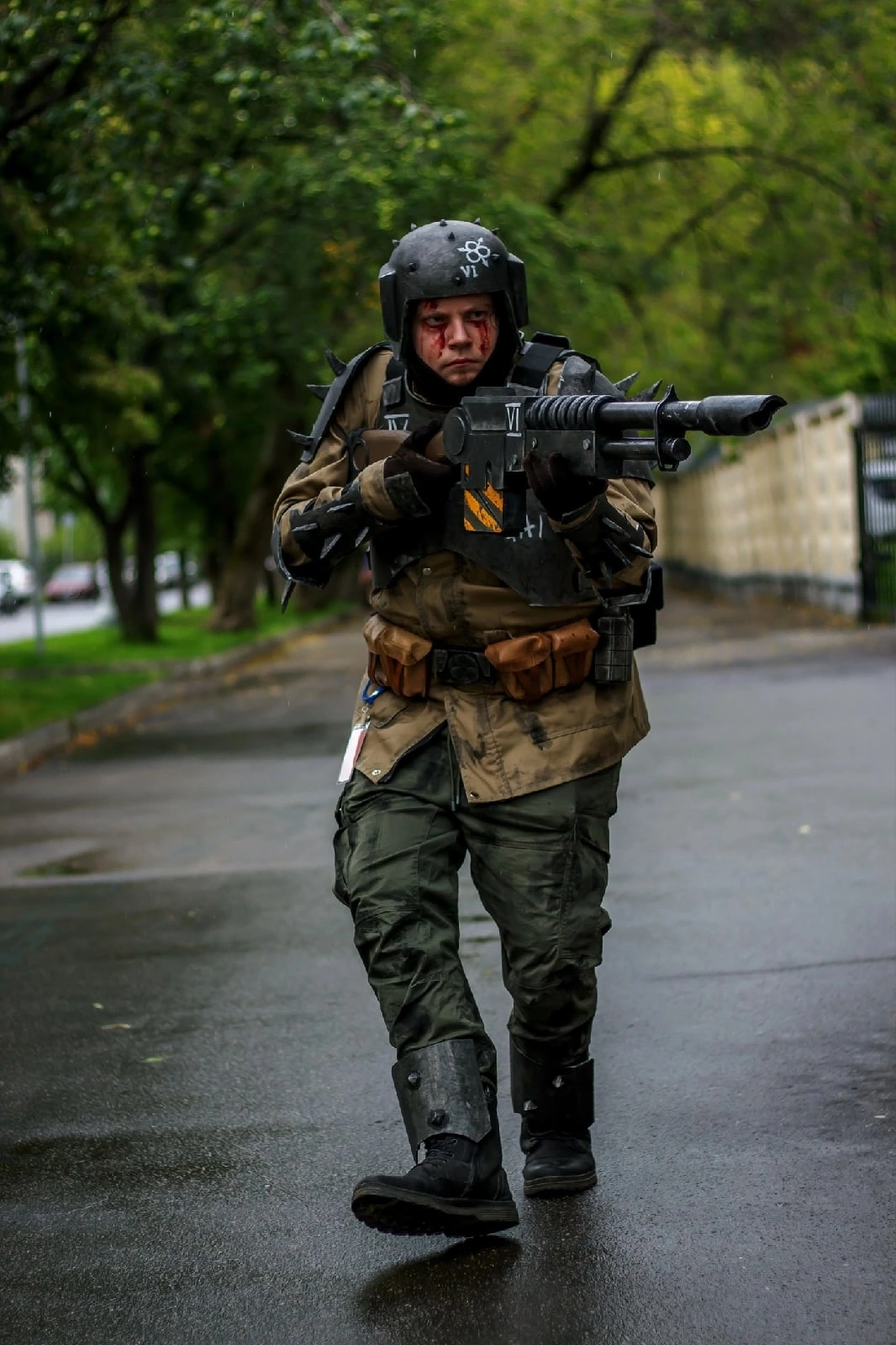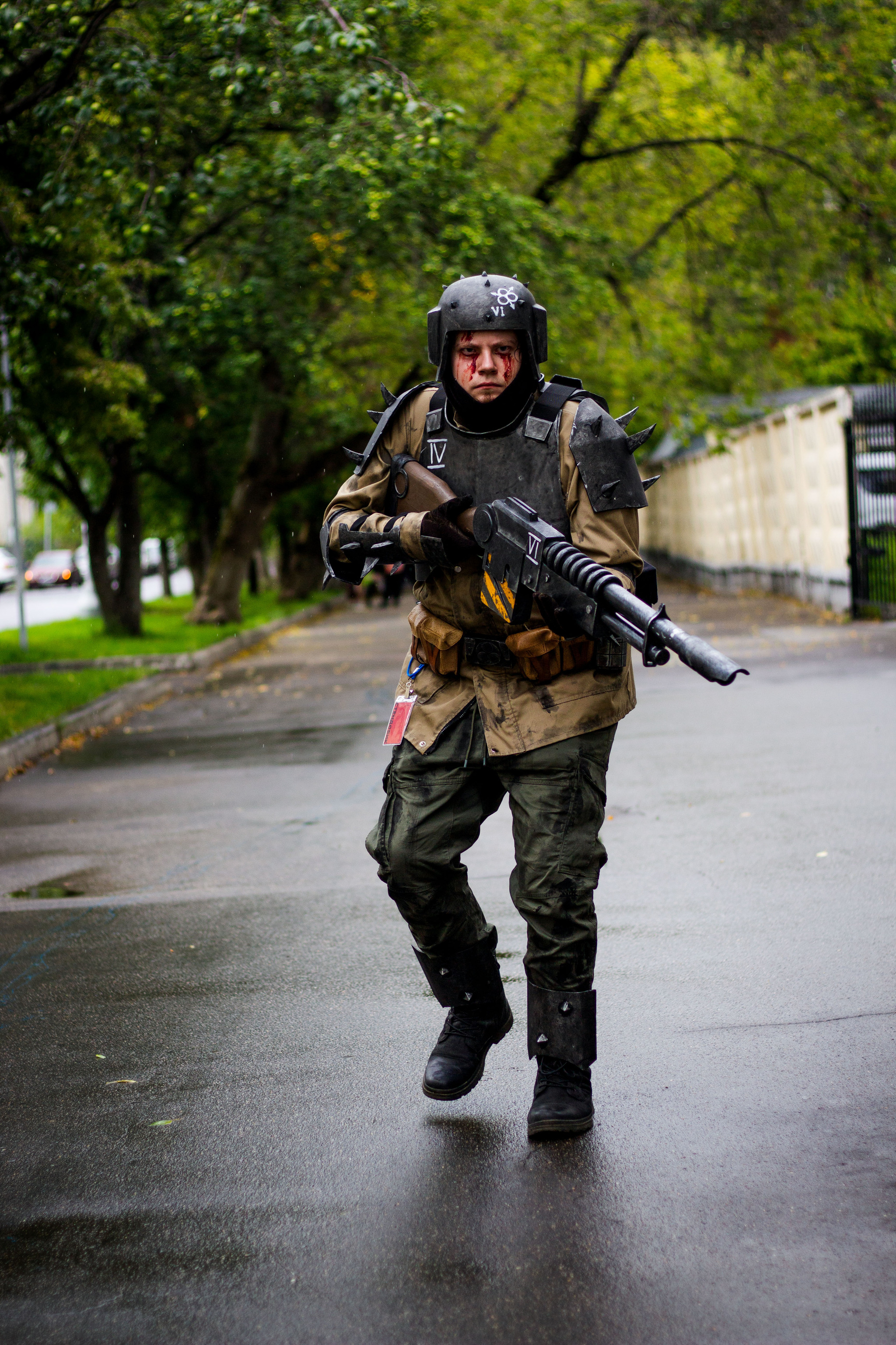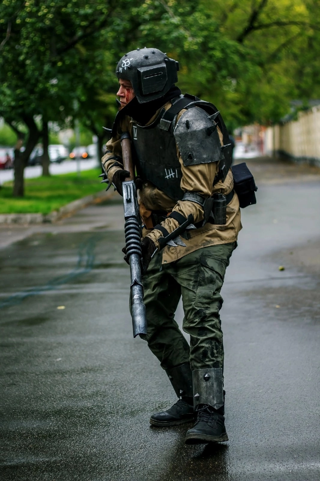 Что пришлось крафтить - кираса, плечи, налокотники и броня на руки были сделаны из остатков брони клона из ЗВ, которые я нашёл на даче. Немного простых форм + шипы + ремни, тянущиеся ленты + карабины. Покраска стандартная - чёрный грунт из баллонов, металлик из баллона, затемнение и лак.