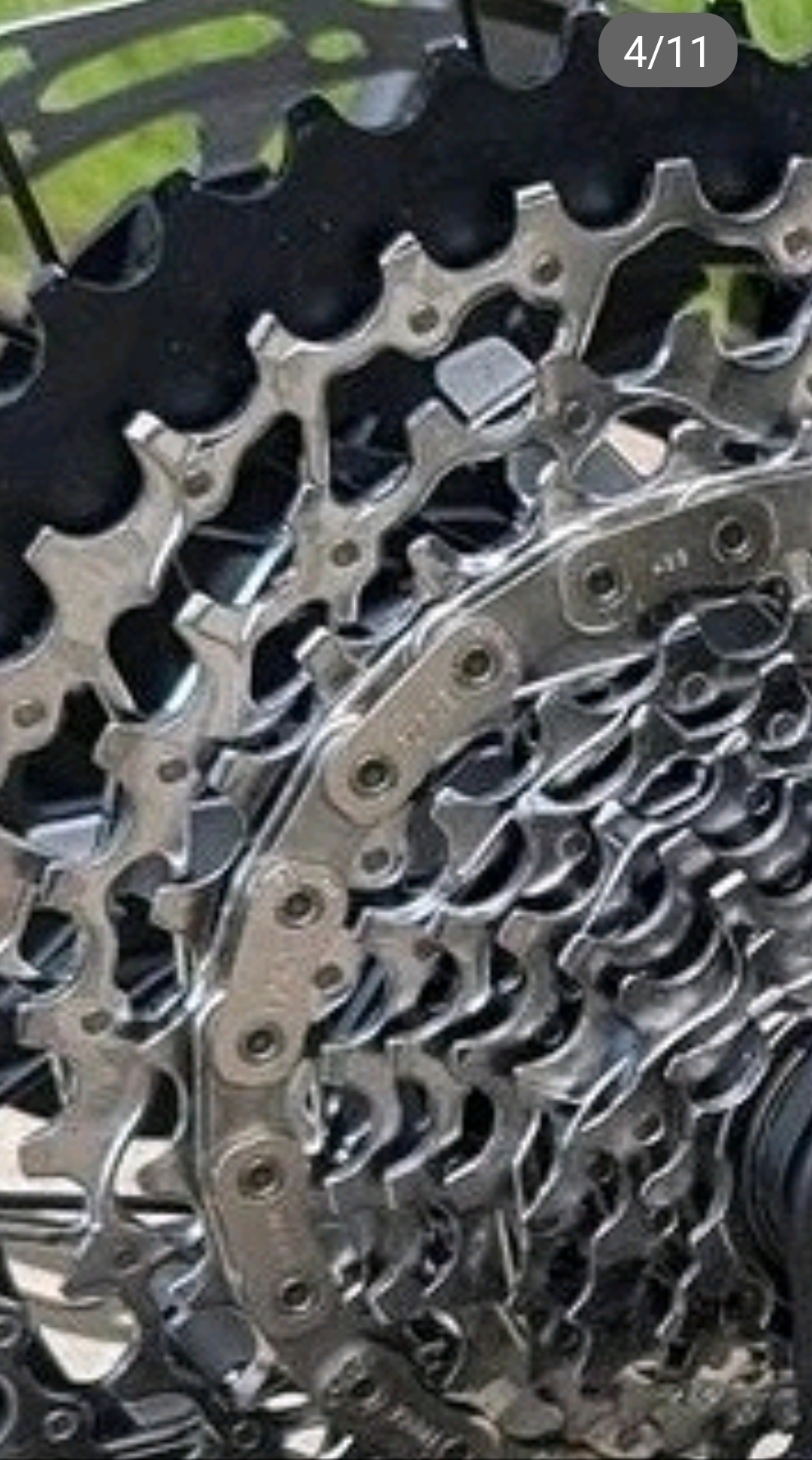 Заметь что кривые зубья через 2-3 зуба только на внутренних звездах, на самой большой самой крайней они одинаковые. Это сделано для того, чтобы цепь легче переключалась на высокой скорости её вращения. И сама цепь такая по форме, потому что звезд 12 на заднем колесе, а спереди лишь одна. Возникают большие перекосы при переключении между звёзд. Для этого стали делать тоньше сами звёзды на заднем колесе, и тоньше цепь. Кстати цепь 12 скоростной трансмиссии почти вдвое тоньше какой-нибудь цепи на 6-8 скоростей. И устанавливается такая цепь только одной стороной по ходу движения. И вся ширина комплекта задних звёзд на такой 12 скоростной трансмиссии, лишь на половину толще комплекта звёзд на 7-8 скоростей, когда скоростей на порядок больше.