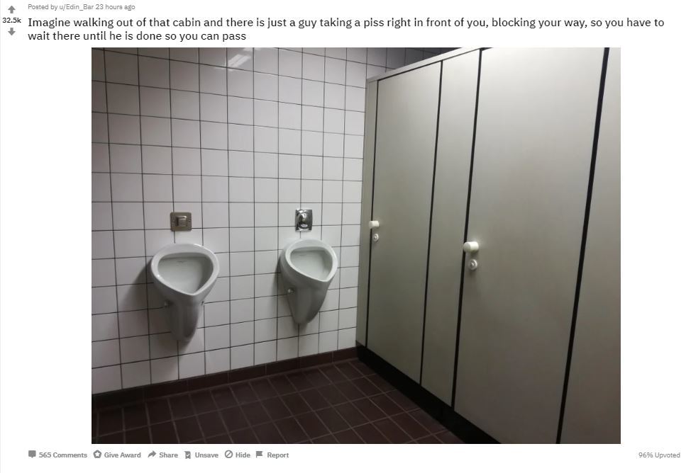 Заголовок: Только представьте, вы хотите выйти из кабинки, но не можете потому что перед вами стоит чувак и ссыт, преграждая вам путь. И вам придется ждать пока он не закончит, чтобы выйти.