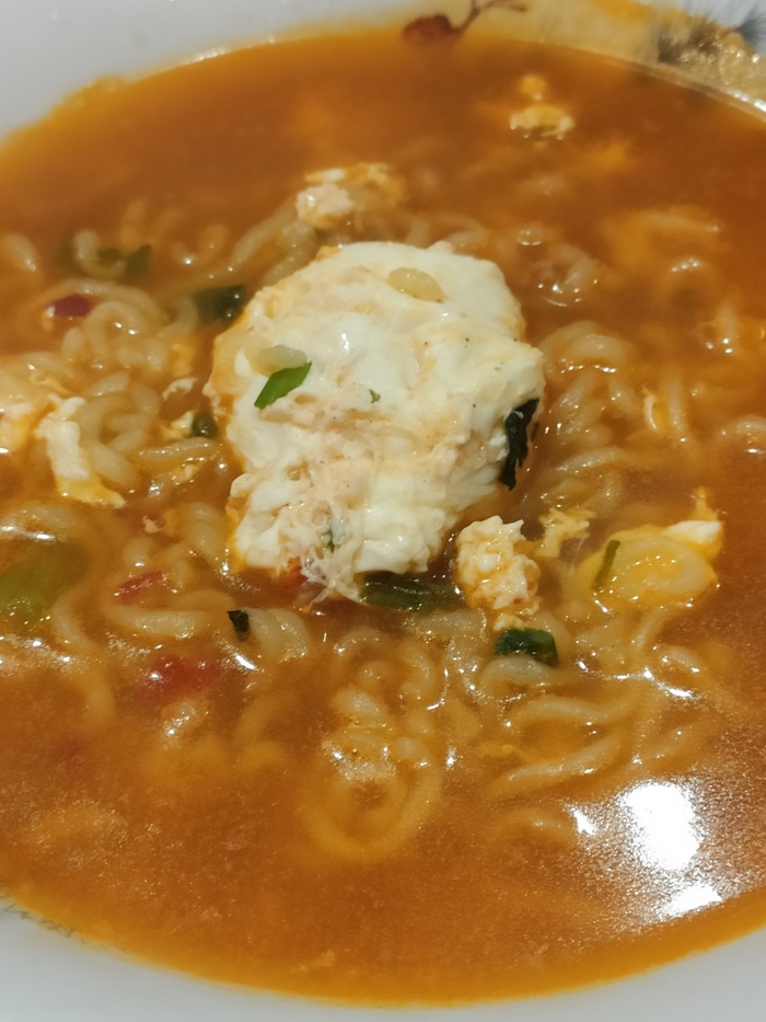 Яйцо, кстати, я вбросила секунд за 30 до окончания времени варки + во время остывания оно всё время было в тарелке. Оно как-то немного обволоклось остротой, а внутри яйцо осталось жидким и в сравнении кажется, прям, сладким.