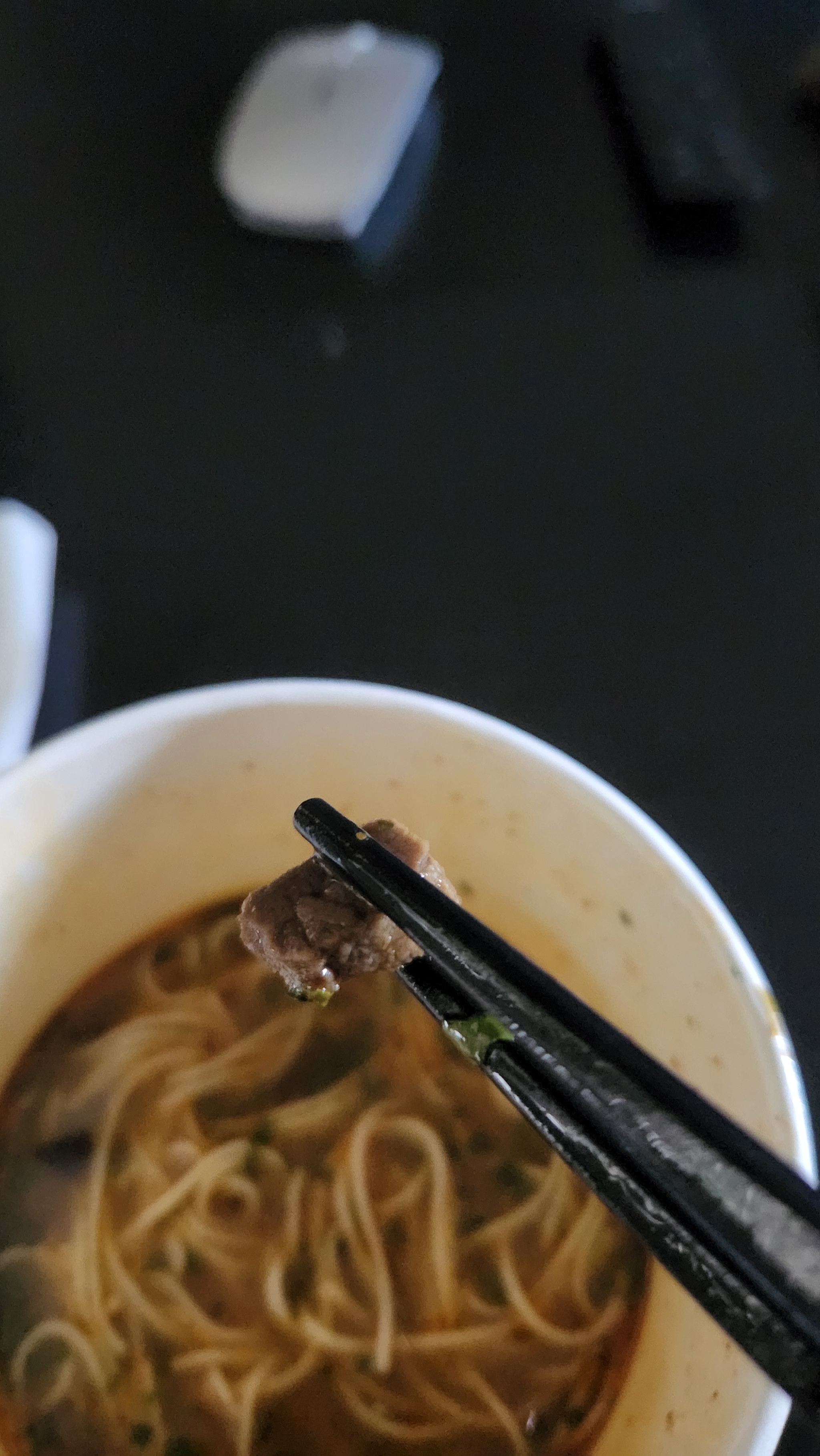 Такс. Это вкусно. Вот прям реально вкусно. Такой вид лапши хоть я и не люблю, но здесь она крайне органично вписывается. Бульон не сильно острый, жирный насыщенный. Я так понимаю всему виной тушенка. Причём грибы успевают отдать часть вкуса в бульон, вкусовая фиерия блин)