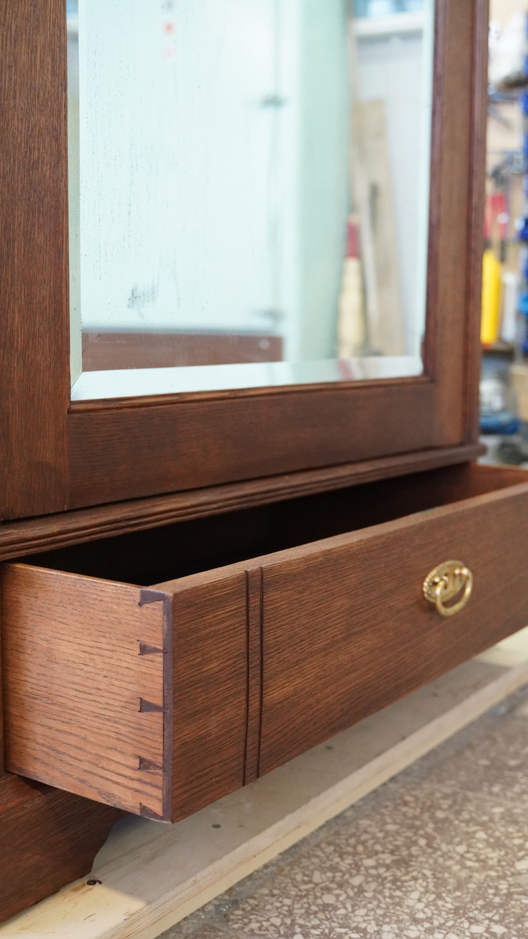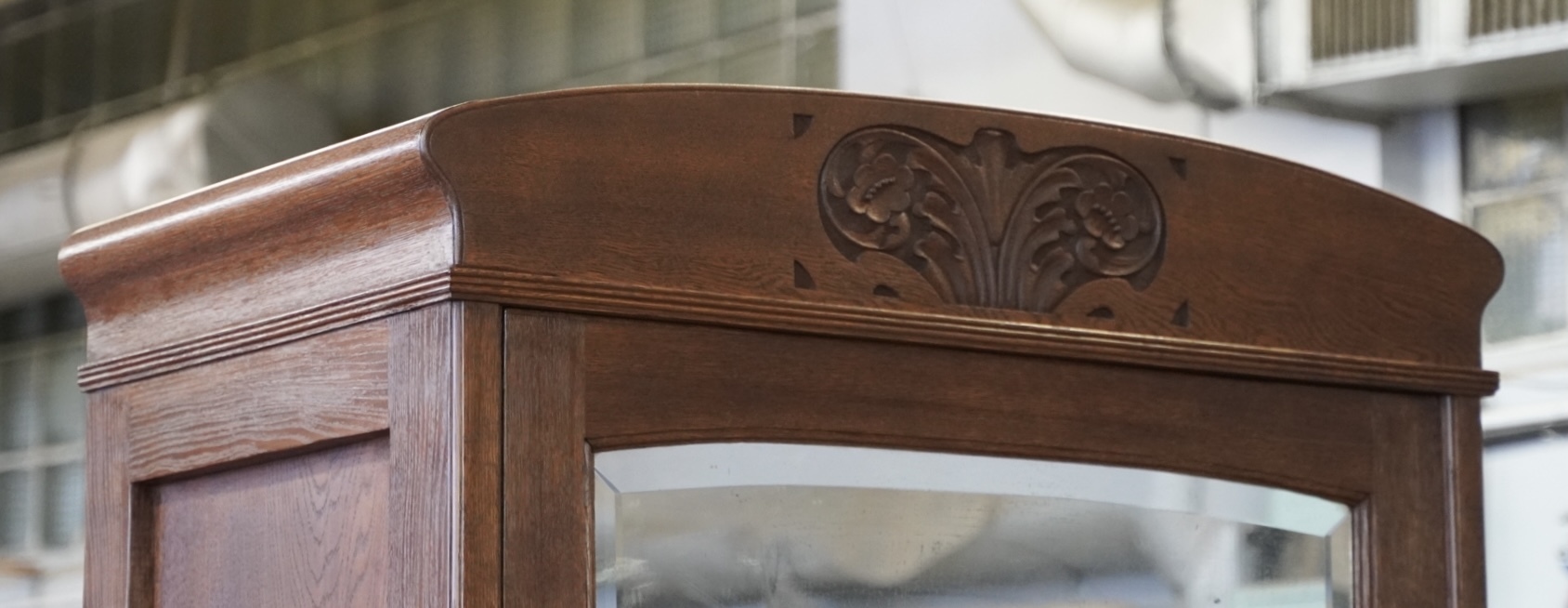 Этот шкаф начала XX века, изначально выполненный в дубовом оттенке, обрёл новую жизнь в цвете тёмный орех.