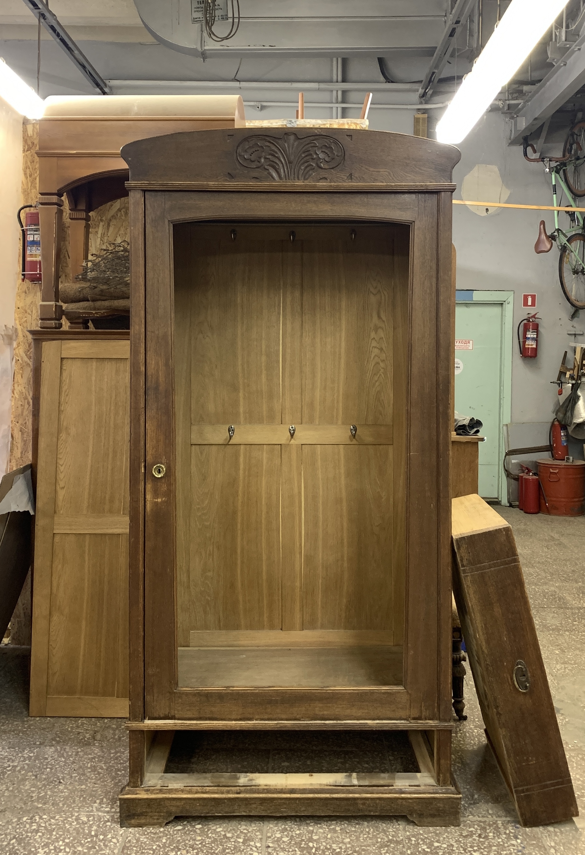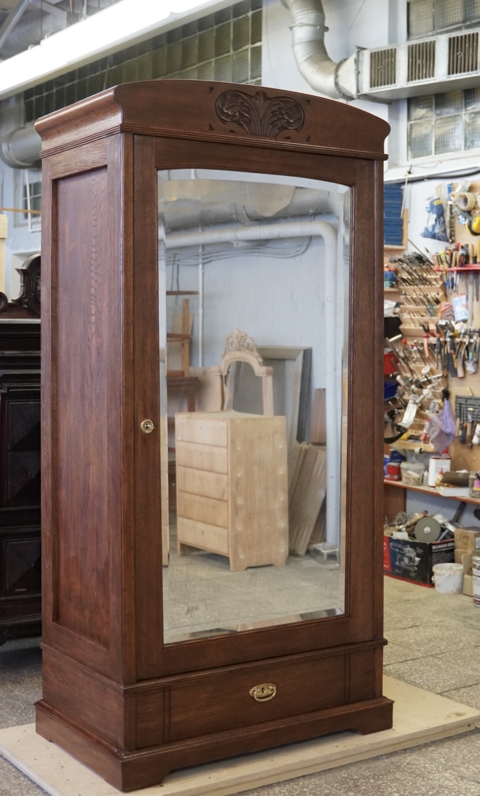 Ключевым этапом стало окрашивание: выбранный оттенок тёмного ореха подчеркнул изящество и придал шкафу современный акцент.