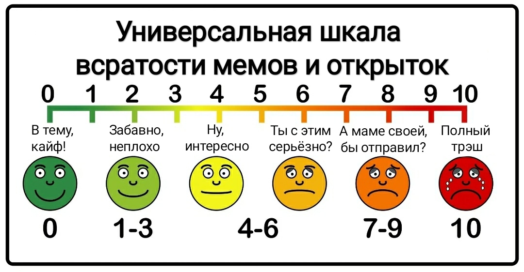 Ronin13 1 год назад Шкала всратости открыток, мемов и поздравлений В рабочем чате в связи с праздником вакханалия. Думаю некоторые люди совсем не понимают границ и масштабов разрушений юмора) Накидал тут на скорую руку. Срочно требуются квалифицированные метрологи для поверки) [моё] Юмор Поздравление Мемы Метрология Ещё 0
