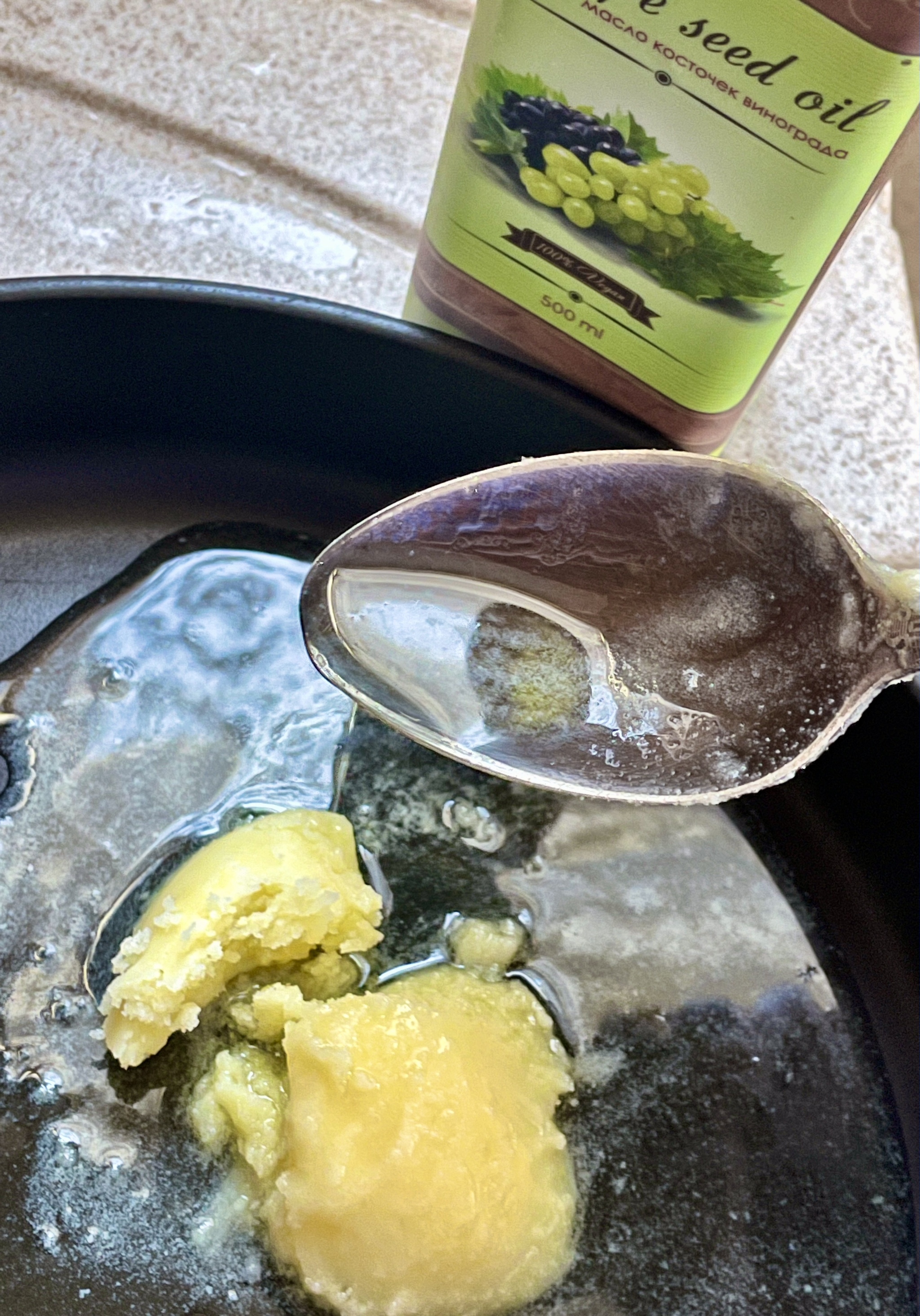 На сковороду выложил я две ложки качественного топленого коровьего масла и три ложки масла из виноградных косточек.