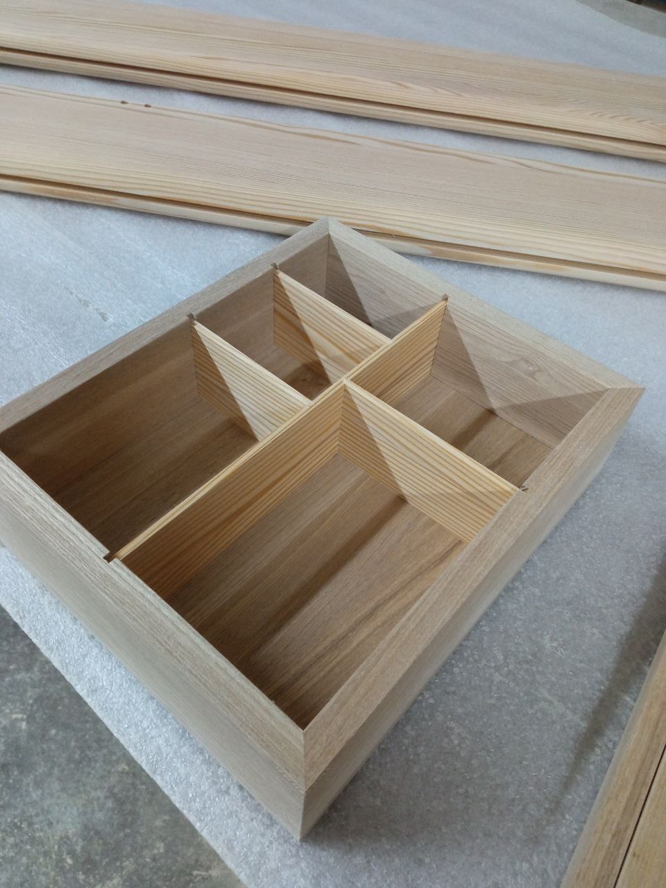 5. Перегородки внутри крышки делались из лиственницы. Высота перегородок чуть выше внутренней полости шкатулки, толщина равна толщине пропила (4 мм). Основная сложность заключалась в центральной перегородке, так как в ней есть пропилы для ещё трех перегородок.