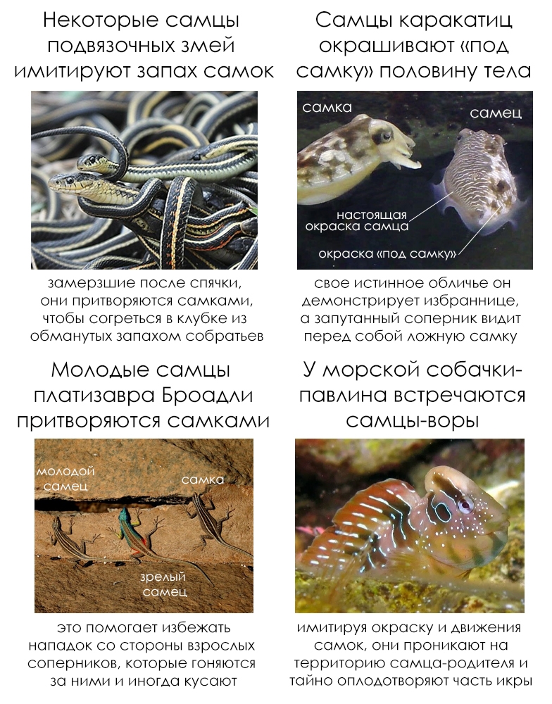 Все знают, что есть животные, которые в течение жизни могут сменить пол с мужского на женский или наоборот, но сегодня я хочу показать вам животных, которые на самом деле менять пол не могут, да и не хотят, но по тем или иным причинам имитируют смену пола.