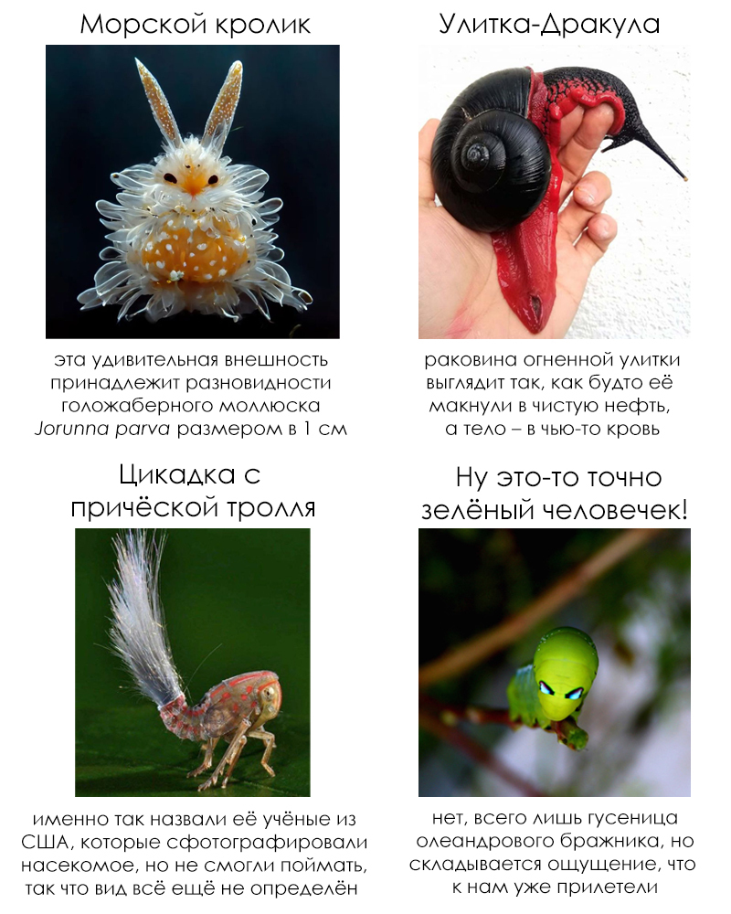 И вновь суббота, а это значит, что я несу вам четыре факта, которыми удивляю школьников на уроках биологии. Сегодня подборка посвящена животным с совершенно инопланетной внешностью.