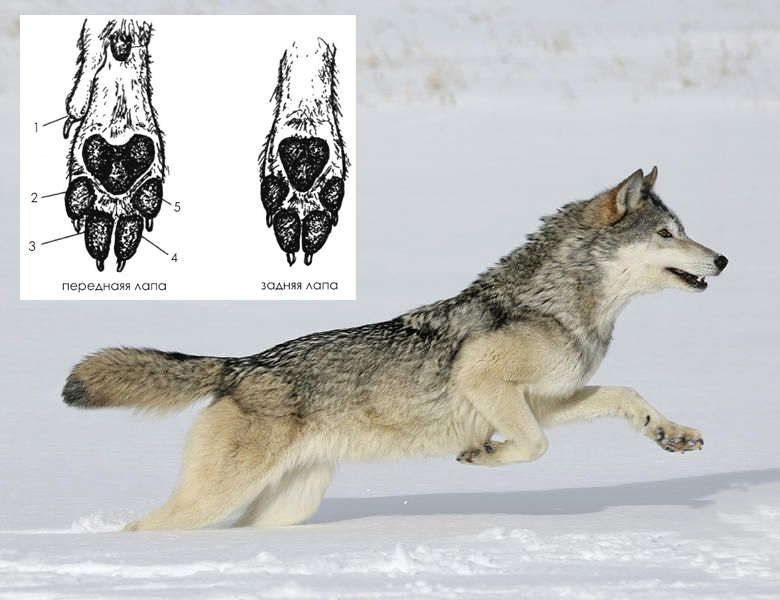 4. Передние лапы волка крупнее задних и имеют дополнительный (на рисунке обозначен цифрой 1) рудиментарный палец с внутренней стороны плюсны.