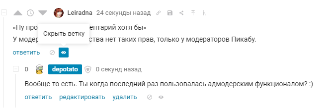 Вообще-то есть. Ты когда последний раз пользовалась адмодерским функционалом? :) Мы с тобой сейчас беседуем в такой скрытой ветке. Да и политика банов для открытых сообществ вроде посвободнее стала, у @SupportCommunity, спроси