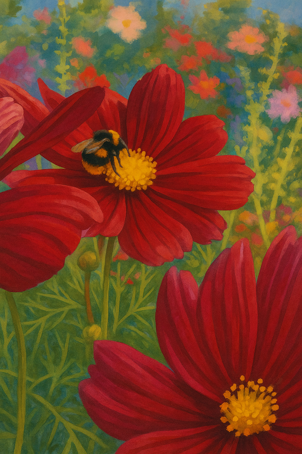 Он мягко погружается в золотую сердцевину, собирая солнечную пыльцу, чтобы унести её дальше — в поля, в луга, в новый день.