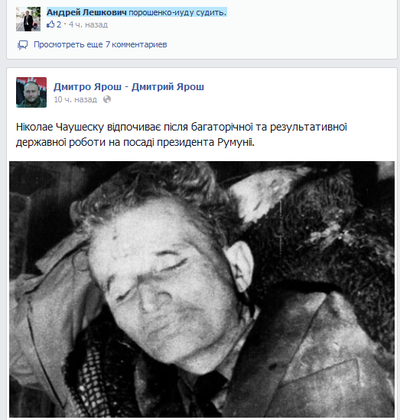 На что Ярош вставляет фото Чаушеску и пишет - "Николае Чаушеску отдыхает после многолетней и результативной государственной работы на посту президента Румынии."