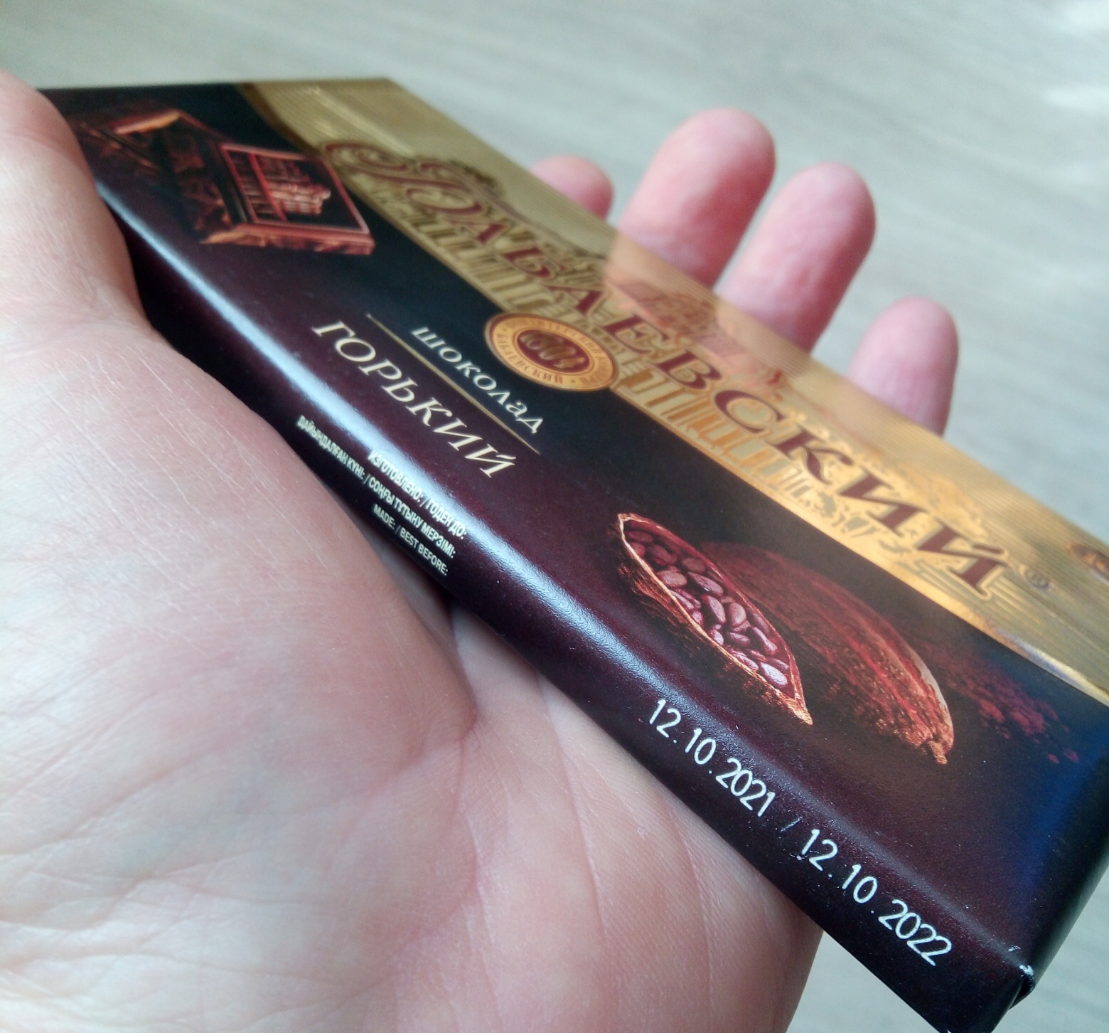 Дата выпуска, аж, октябрь 2021 года. Даже и не помню, кто и за что а может и сам покупал)) Жаль думаю, шоколад горький, мой любимый, испортился наверняка, эх... Открыл и удивился, не плесени, ни налёта, нормальный аромат шоколада.Отломив увидел хороший цвет на изломе, и решился попробовать. Знаете, кроме того, что стал жестче, всё же подсох за четыре года, ничего на вкус не изменилось. Нормальный шоколад! И хотя "Бабаевский" не суперэлитный образец шоколада, но среди недорогих вполне себе неплох. Вообщем, порадовался за "Бабаевский", так держать!