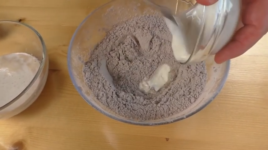 В муку добавляем сахар, соль и какао, хорошо перемешиваем. После чего вводим сметану и опару и мягкое масло. Вымешиваем тесто несколько минут.