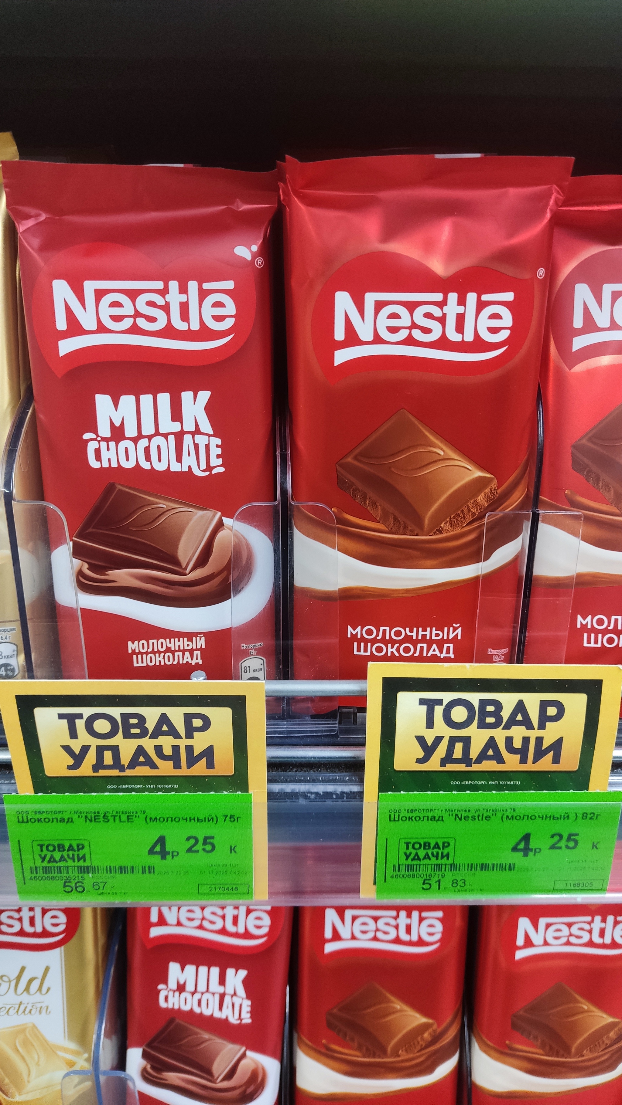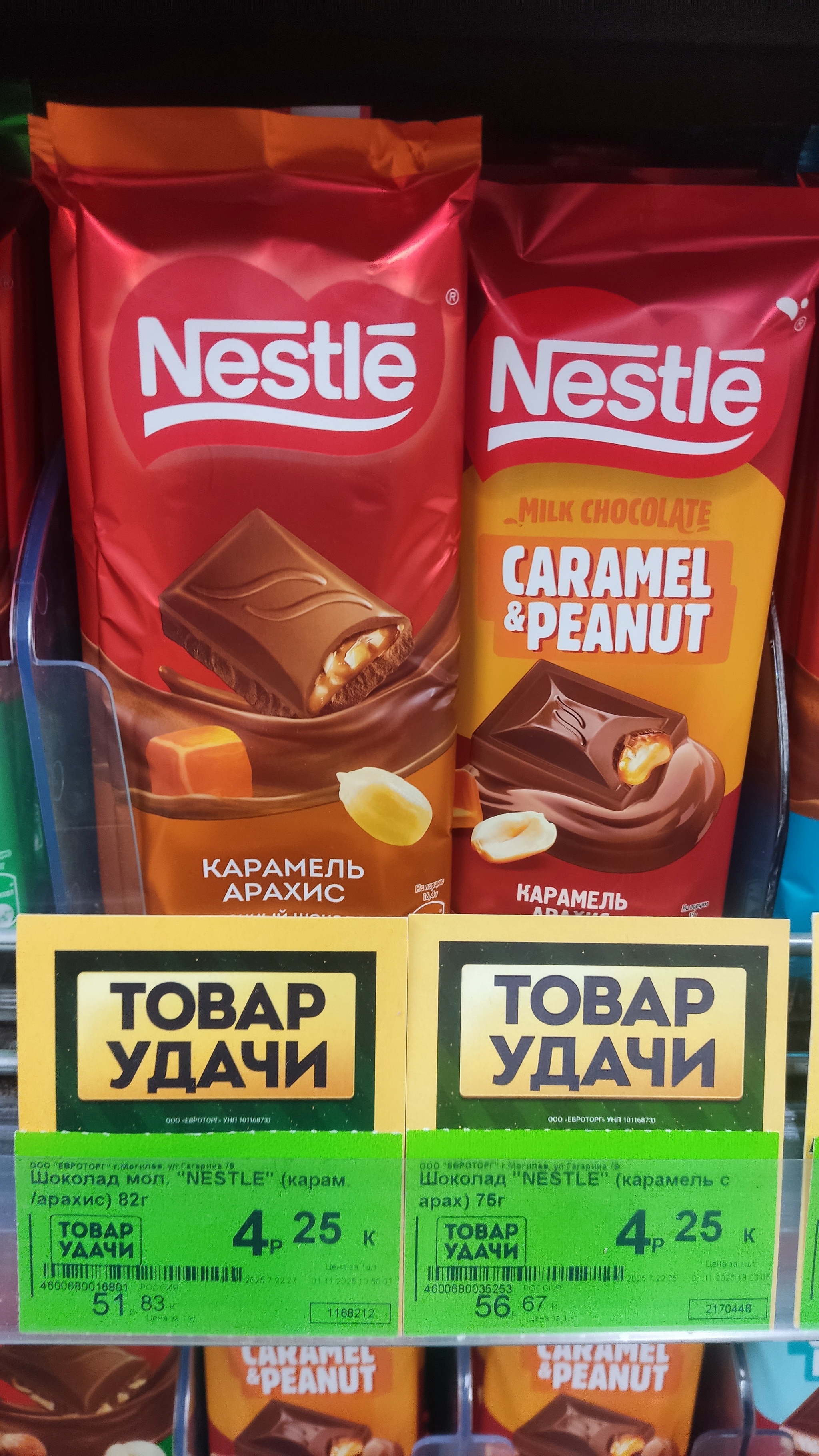 Ну а в данном случае получилось вполне заметно, потому что старые шоколадки ещё не успели распродать. В результате по одной и той же цене имеем старые шоколадки весом 82гр и новые шоколадки весом 75гр. По весу минус 7гр или аж минус 8,5%.