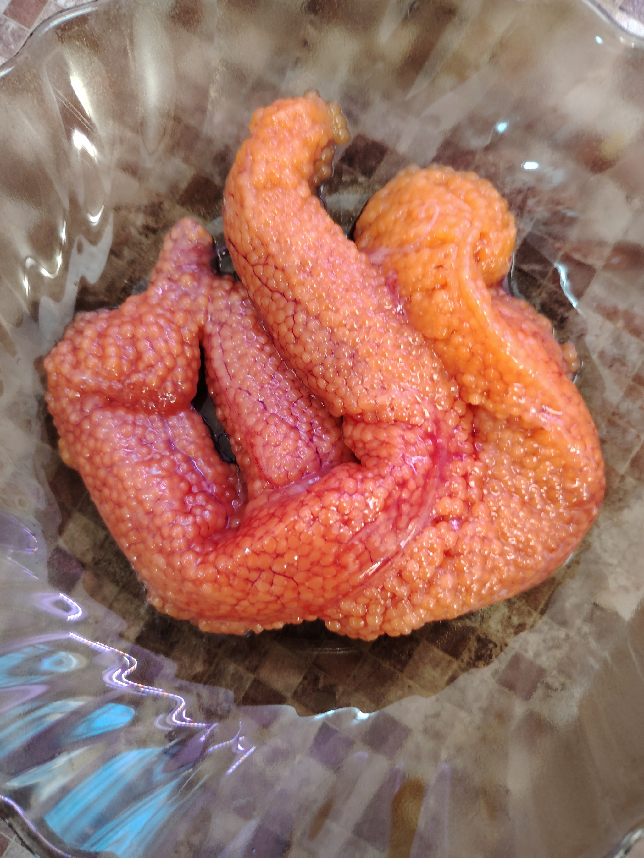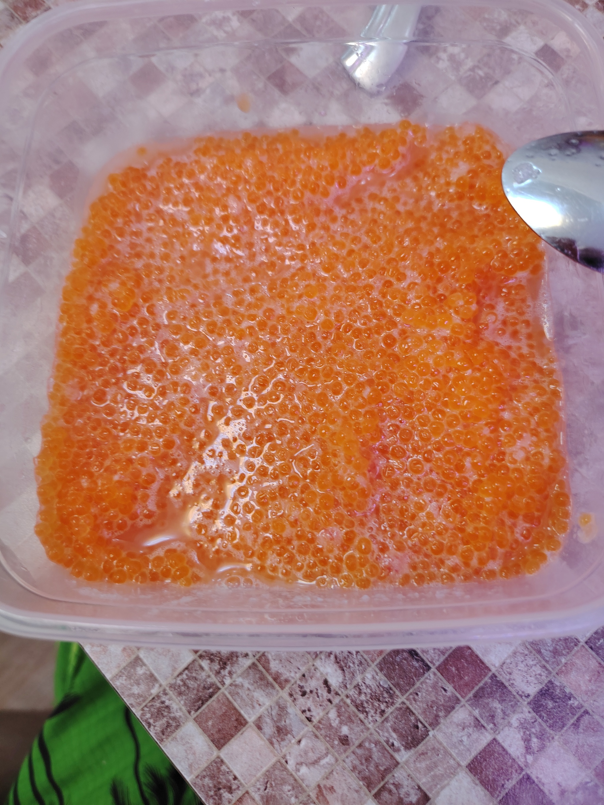 Плево наматывается на венчик, убираем. Потом прогоняем икру через сито, промываем в холодной воде и укладываем в контейнер. Три чайные ложки соли, мешаем, и на сутки в холодильник. Завтра попробуем 🤣