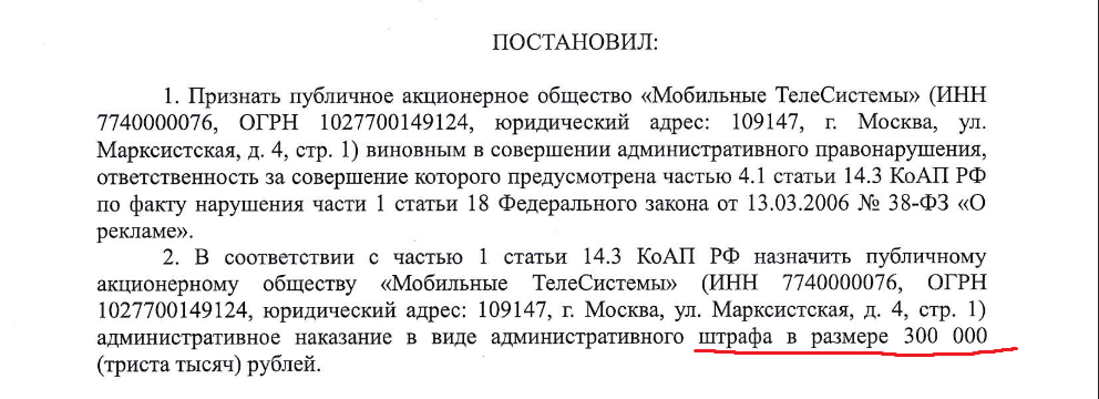 Немного морального удовлетворения. В октябре прошлого года на рекламу в УФАС пожаловался. Вот только позавчера пришло письмо от них. Выкатили МТС штраф на 300К. Хотел ещё, как закончат, на моральный интереса ради попробовать. Но поздно уже, наверное.