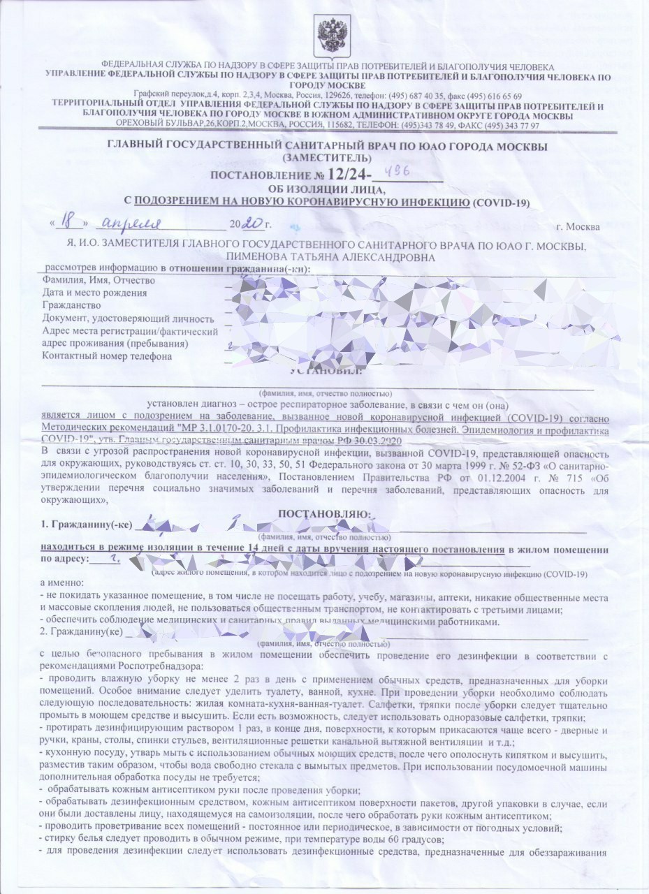 18 апреля приходил врач, сменить тактику лечения, добавить антибиотики и заодно выдала предписание о моем карантине, ну ок, подписала, сидела дома до 02 мая.