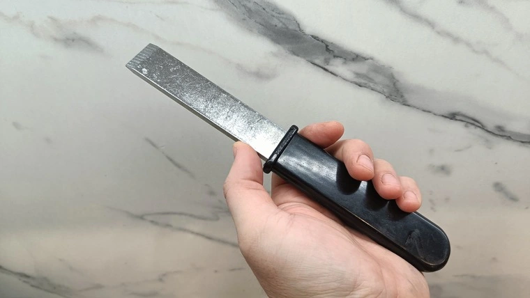 Стамеска по бетону с металлическим телом толщиной более 5 мм. Имеет заточенное основание и рукоятку из пластика. Предназначается для скола бетона после штробления. В принципе все это можно выполнять и обычной отверткой, но при максимальной ширине пропила штробы, комплектной стамеской будет проще.