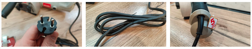 Начнем пожалуй с провода питания. Тут он 2 метровый, в технических характеристиках это не указано. Оболочка жесткая резина или мягкий пластик, что-то среднее, но на холоде дубеет, хотя не лопается. Используется вилка на 16А, а сечение проводников 2*1 мм2. Что соответствует заявленным характеристикам по мощности. Место входа кабеля в инструмент защищает массивный резиновый кембрик.