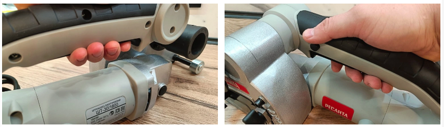Боковая ручка из пластика, но с резиновым покрытием. Устанавливается на штроборез с помощью болтового соединения. Внутри полая. С ней действительно будет проще вести работы, удерживая инструмент в нужном направлении.