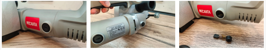На корпусе размещаются круглые заглушки предназначенные для быстрой замены графитовых щеток. Через окно можно будет дополнительно оценить состояние ламелей электродвигателя. Тут же наклейка с информацией о производителе.