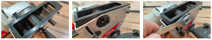 В передней части размещается металлический защитный кожух. Он прикрывает установленные пилящие диски. Для удобства обслуживания и установки дисков предназначено окно. Оно удерживается на винте с "барашком". Рядом с них размещается шкала регулировки вылета глубины реза. После выбора необходимой глубины потребуется блокировка винтом.