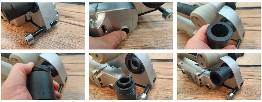 С обратной стороны защитного крана присутствует клапан, через который устанавливается пылесос. Клапан съёмный и имеет резиновую манжету. Под ним можно увидеть кнопку блокировки вращения шпинделя, которая потребуется во время замены или установки дисков.