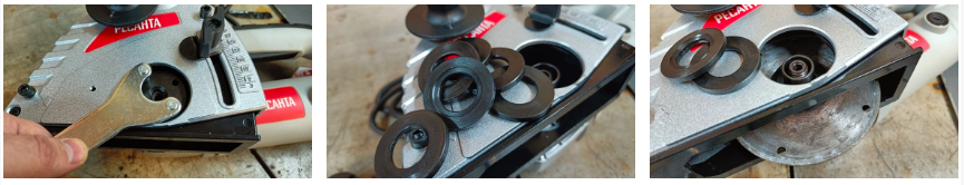 Внутри проставочные шайбы позволяющие подобрать необходимую ширину штробы. Для установки дисков нужно воспользоваться комплектным ключом. Окно для установки дисков довольно узкое и не всегда удобно накидывать шайбы на вал.