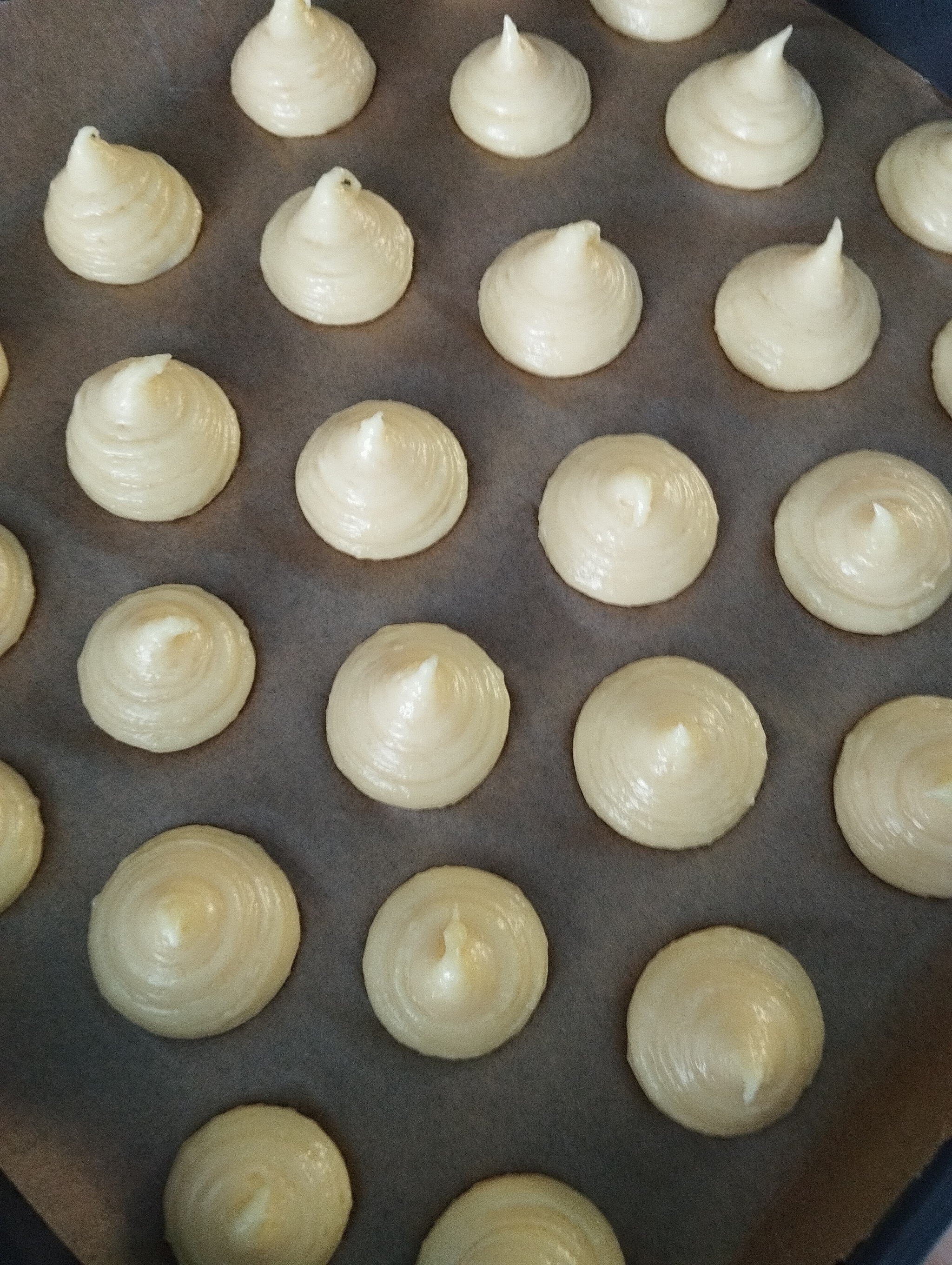 Отсаживаем наши заварные пирожные на противень, оставляя место между ними, так как в процессе выпечки они увеличатся в объёме.
