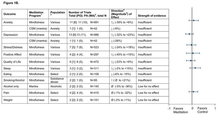 Программы медитации осознанности имели умеренные доказательства уменьшения тревожности через 8 недель; депрессии через 8 недель, а также низкий уровень доказательности улучшения качества жизни, связанной со стрессом / дистрессом и психическим здоровьем. Мы обнаружили либо низкие доказательства отсутствия эффекта, либо недостаточные доказательства какого-либо влияния программ медитации на позитивное настроение, внимание, уменьшения употребление психоактивных веществ, прием пищи, сон и вес. Мы не нашли доказательств того, что программы медитации лучше любого активного лечения (лекарства, упражнений и пр.)