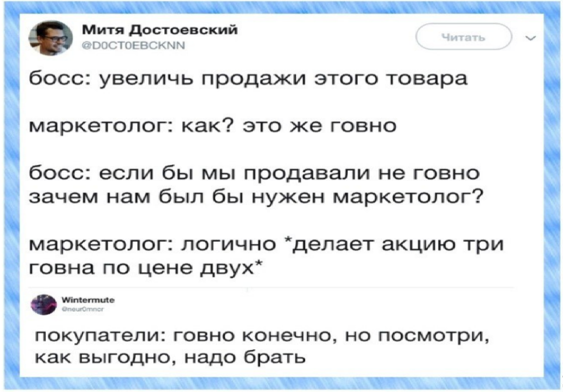 9 user11158101 Шутка про маркетологов 3 месяца назад Скриншот Зашакалено Митя Достоевский (Twitter) Комментарии Маркетологи Акции X (Twitter) 2 Ещё 0