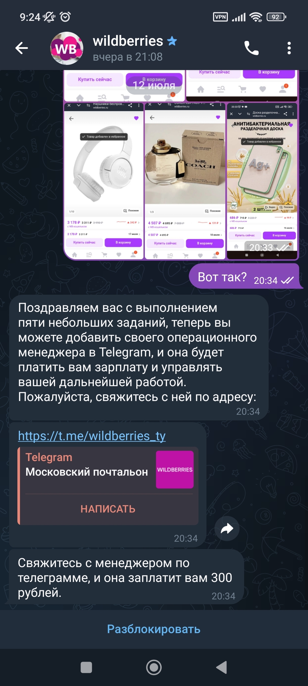 Понятно что тема далеко не новая, однако все ещё рабочая. Время от времени в телеге приходят сообщения от неизвестных аккаунтов с предложением заработать, добавляя товар в избранное на валдберис. Раньше условно платили по 100р за лайк, потом стали платить по 60р.