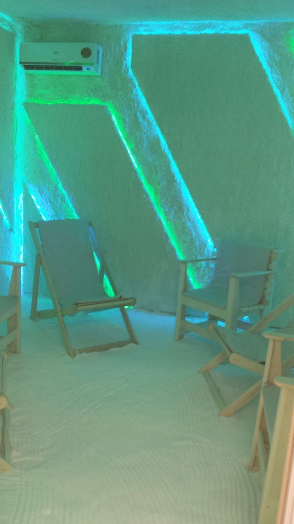 Я в 7-м классе когда была, отправили меня как-то в санаторий, и там тоже была соляная комната, из каменной соли было всё: стены, пол, !потолок, по периметру были ниши с лампочками, в которые ещё были насыпаны небольшие куски той же соли, в середине комнаты был типа костёр: тоже углубление круглое и соляные камни горкой. Ну, и конечно же музыка релаксирующая). Я как-то пробовала лизнуть стену, но стена была не особо вкусная, ибо была из краснокаменной соли, а это типа кирпича с солью. Там был ещё другой вид, но самая клёвая была белая соль, там просто кристаллы чистой соли, хоть клади в суп и мешай, хуле.