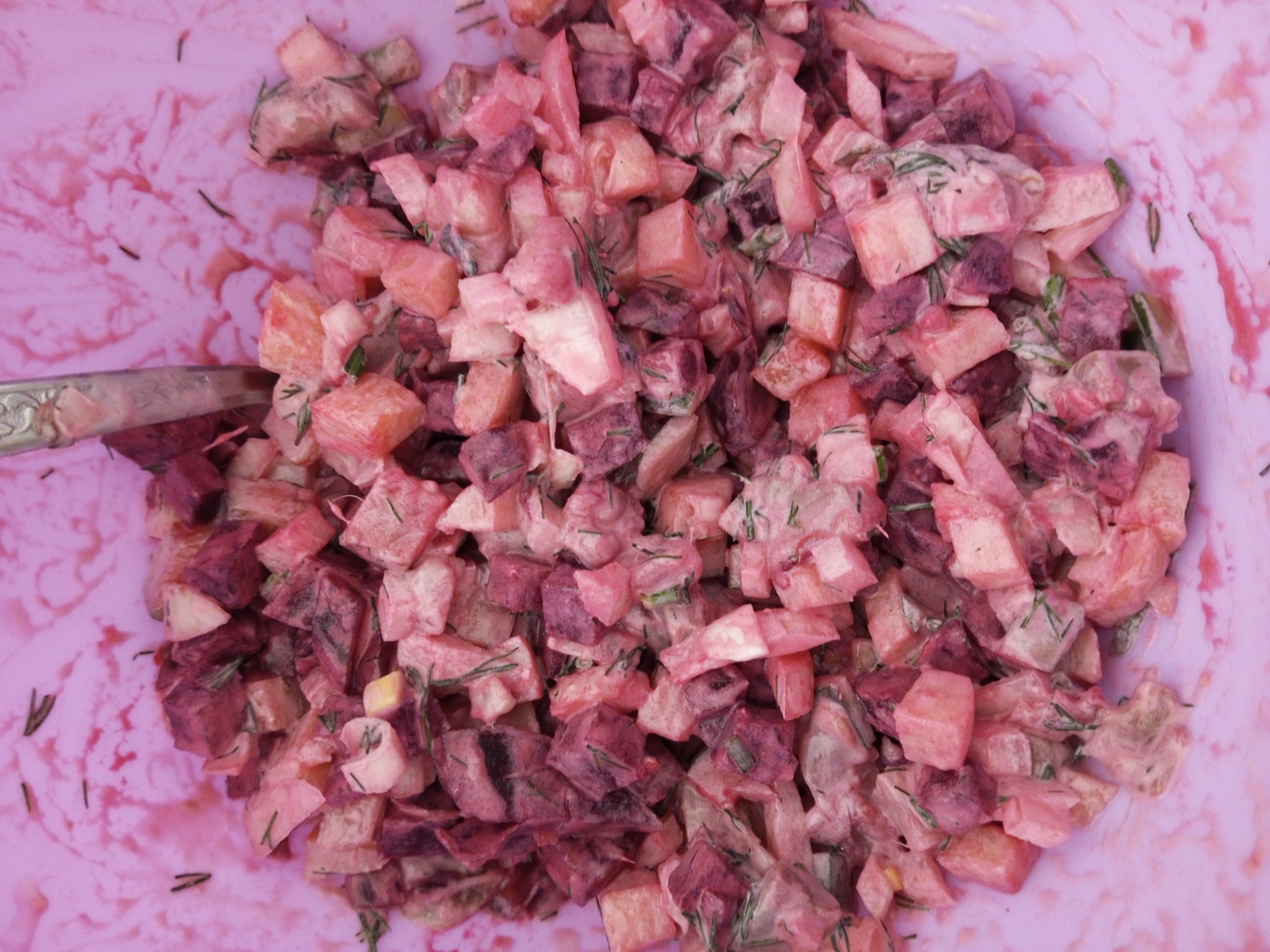 Туда же отправляем небольшой пучок мелко нарезанного укропа. Филе сельди в количестве 200 гр нарезаем кубиком со стороной полсантиметра, как и овощные составляющие салата. Перекладываем сельдь в миску к остальным ингредиентам.